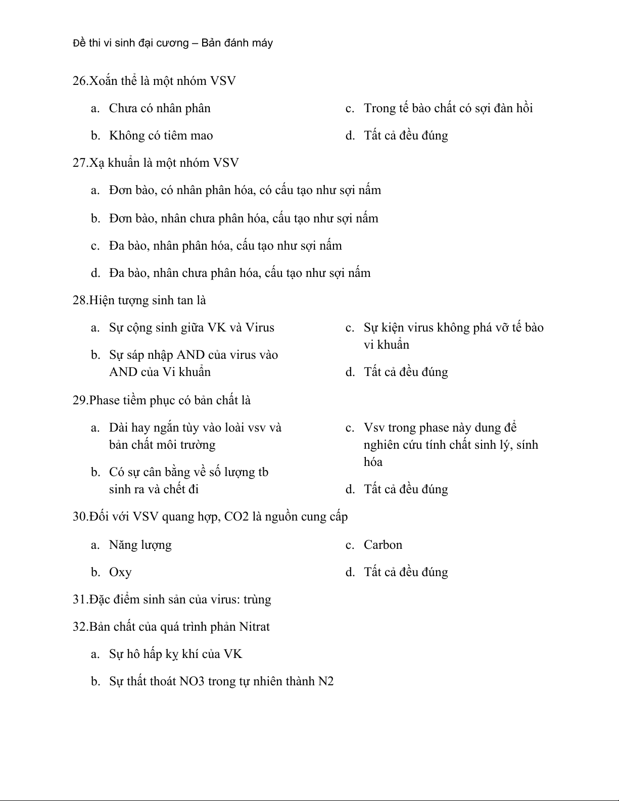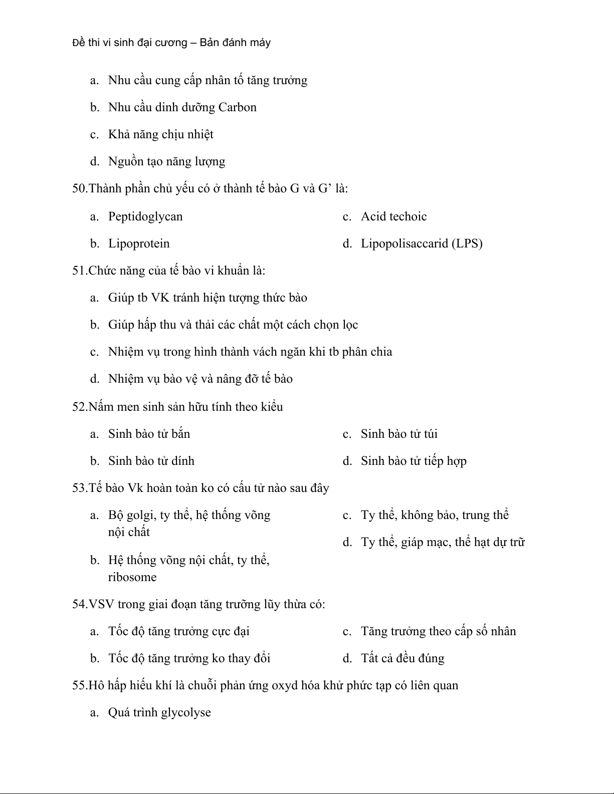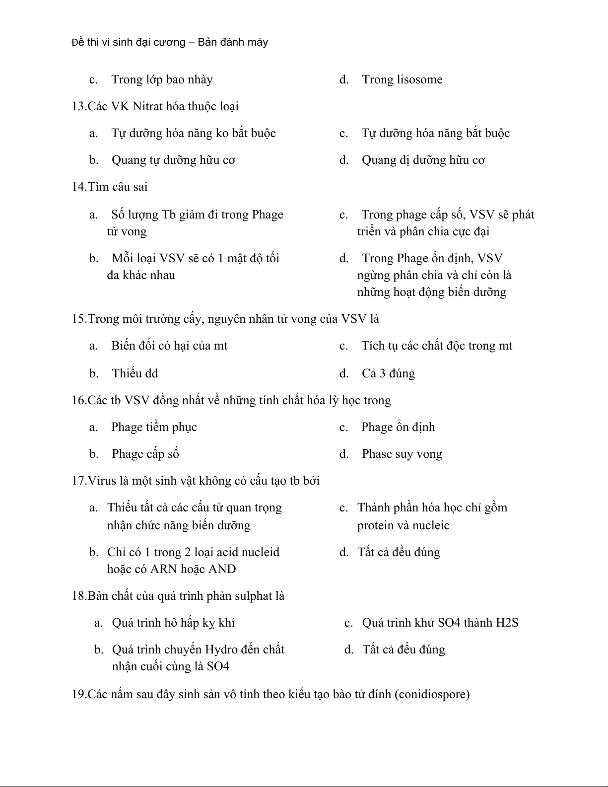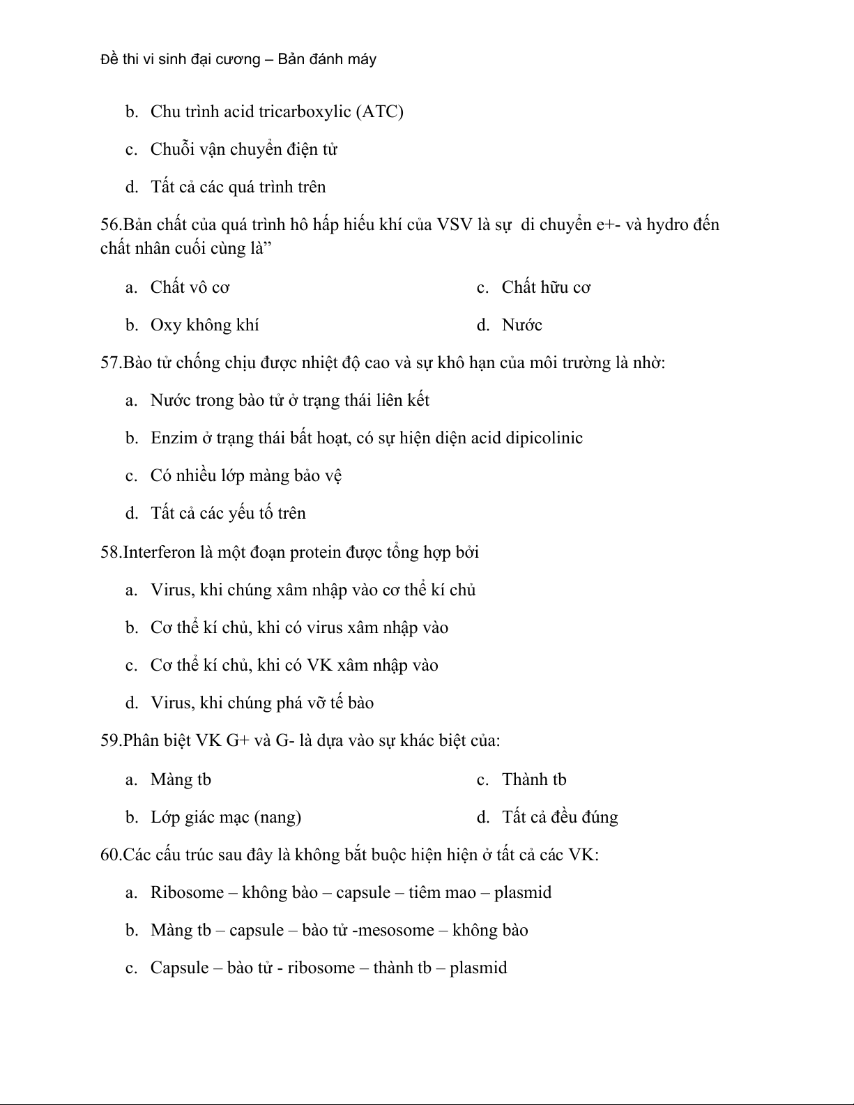 Đề thi vi sinh đại cương – Bản đánh máy c. Trong lớp bao nhày d. Trong lisosome
