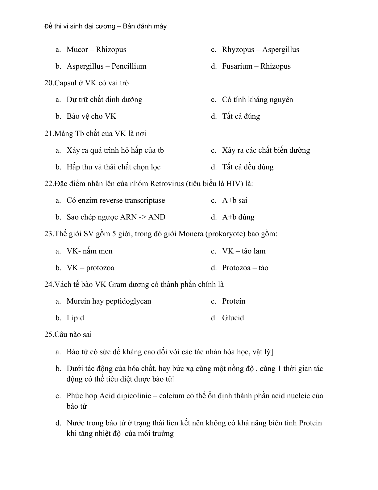 Đề thi vi sinh đại cương – Bản đánh máy a. Mucor – Rhizopus c. Rhyzopus – Aspergillus b. Aspergillus – Pencillium d. Fusarium – Rhizopus 20.Capsul ở VK có vai trò