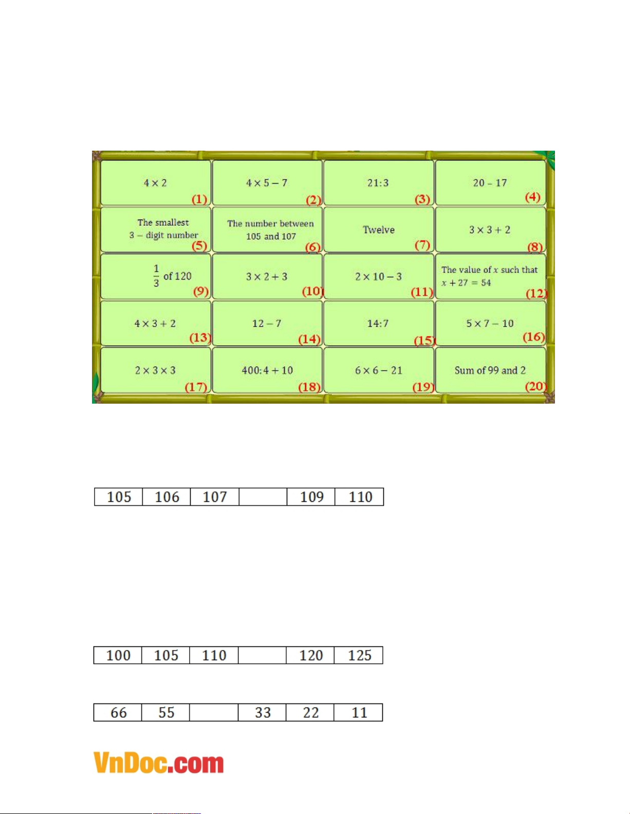 thirty five years old now. How old is son now? a. 4 b. 5 c. 6 d. 3 ĐÁP ÁN Exam number 1: Question 1: < Question 2: 3000 Question 3: 40 Question 4: 500 Question 5: 70 Question 6: 137 Question 7: 170 Question 8: 12 Question 9: 700 Question 10: 50 Exam number 2: Question 1: 64 Question 2: 24 Question 3: 32 Question 4: 48 Question 5: 40 Question 6: 60 Question 7: 56 Question 8: 46 Question 9: 2 Question 10: 3 Exam number 3: Question 1: a Question 2: b Question 3: d Question 4: d Question 5: b