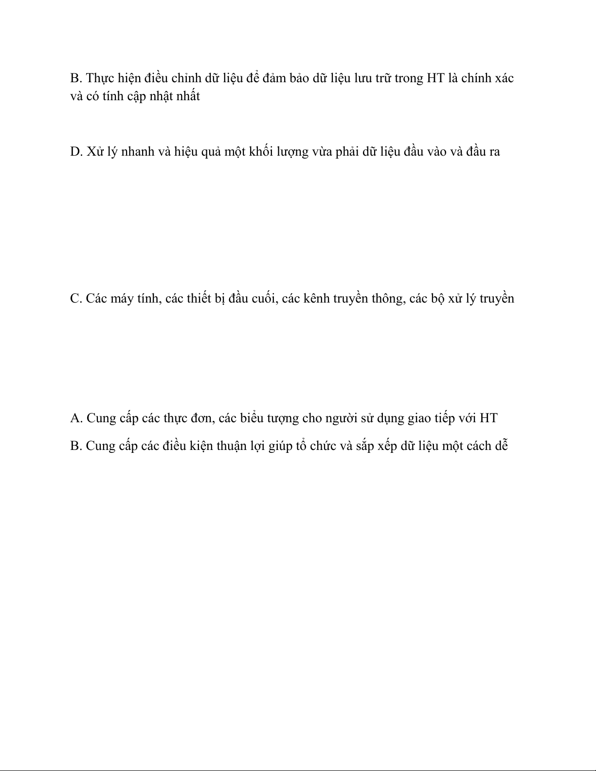 Câu 30: Phát biểu nào sau đây đúng về đặc trưng của HT xử lý giao dịch: