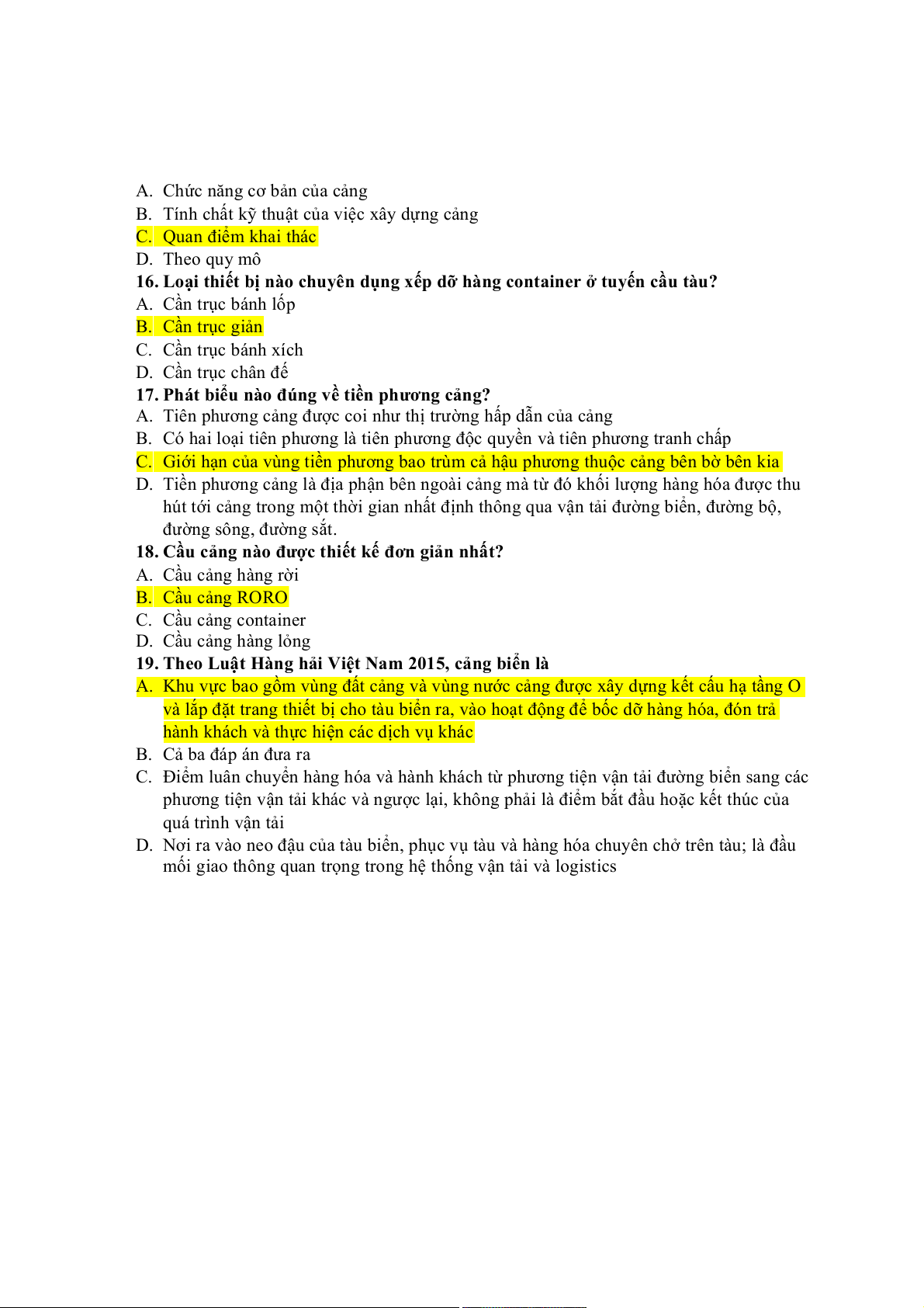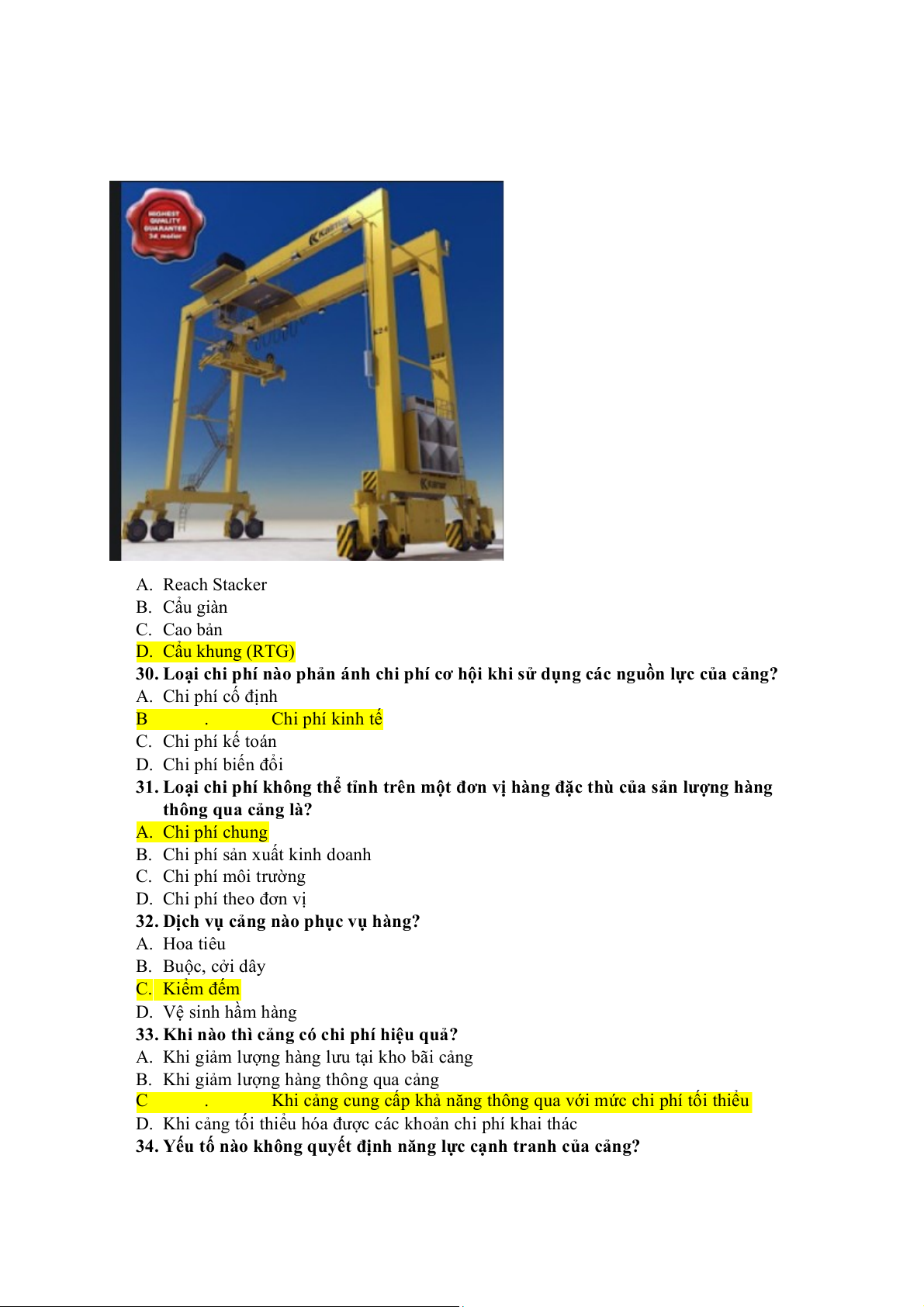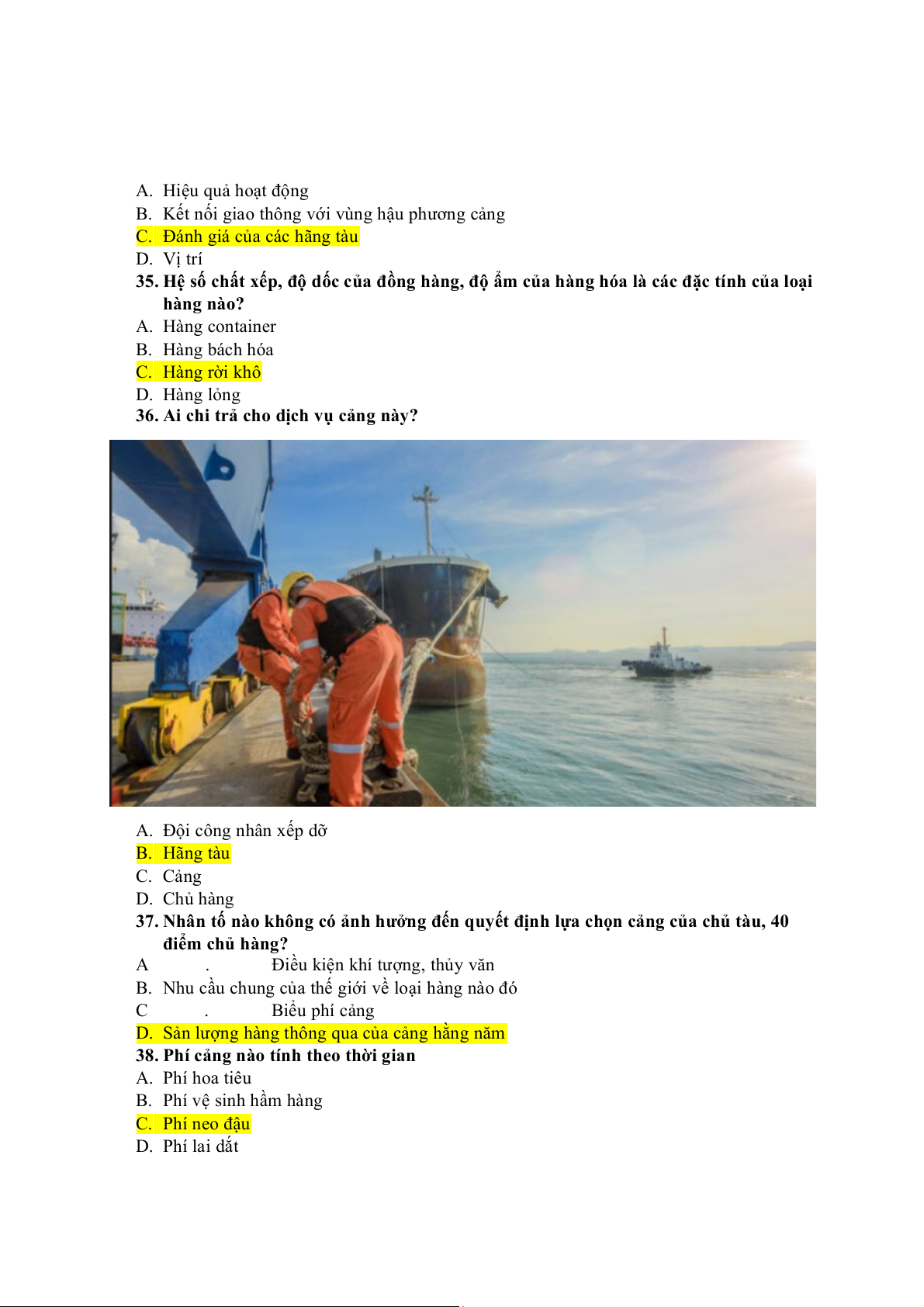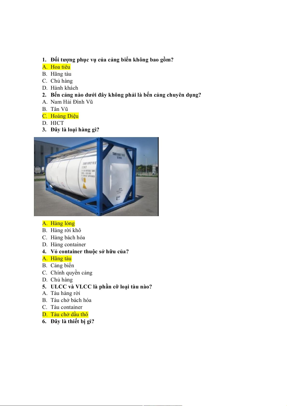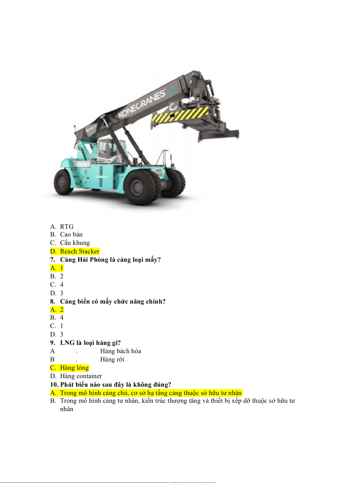 8. Cảng biển có mấy chức năng chính? A. 2 B. 4 C. 1 D. 3 9. LNG là loại hàng gi? A . Hàng bách hóa B . Hàng rời C. Hàng lỏng D. Hàng container