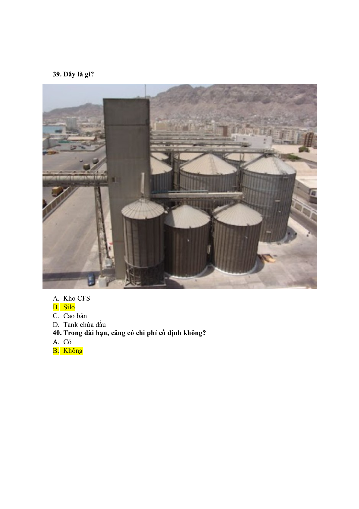 38. Phí cảng nào tính theo thời gian A. Phí hoa tiêu B. Phí vệ sinh hầm hàng C. Phí neo đậu D. Phí lai dắt 39. Đây là gì? A. Kho CFS B. Silo C. Cao bản D. Tank chứa dầu