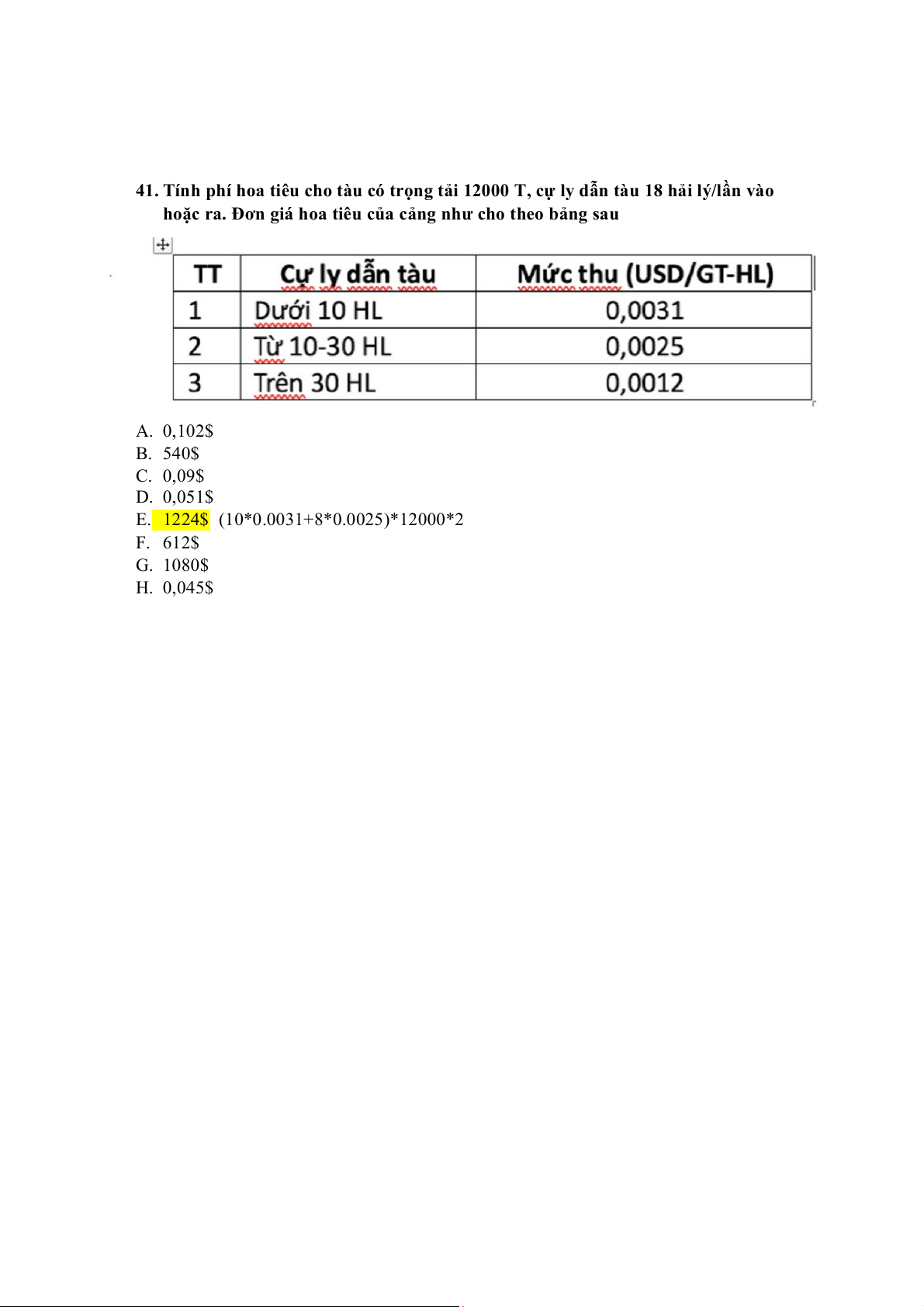 41. Tính phí hoa tiêu cho tàu có trọng tải 12000 T, cự ly dẫn tàu 18 hải lý/lần vào