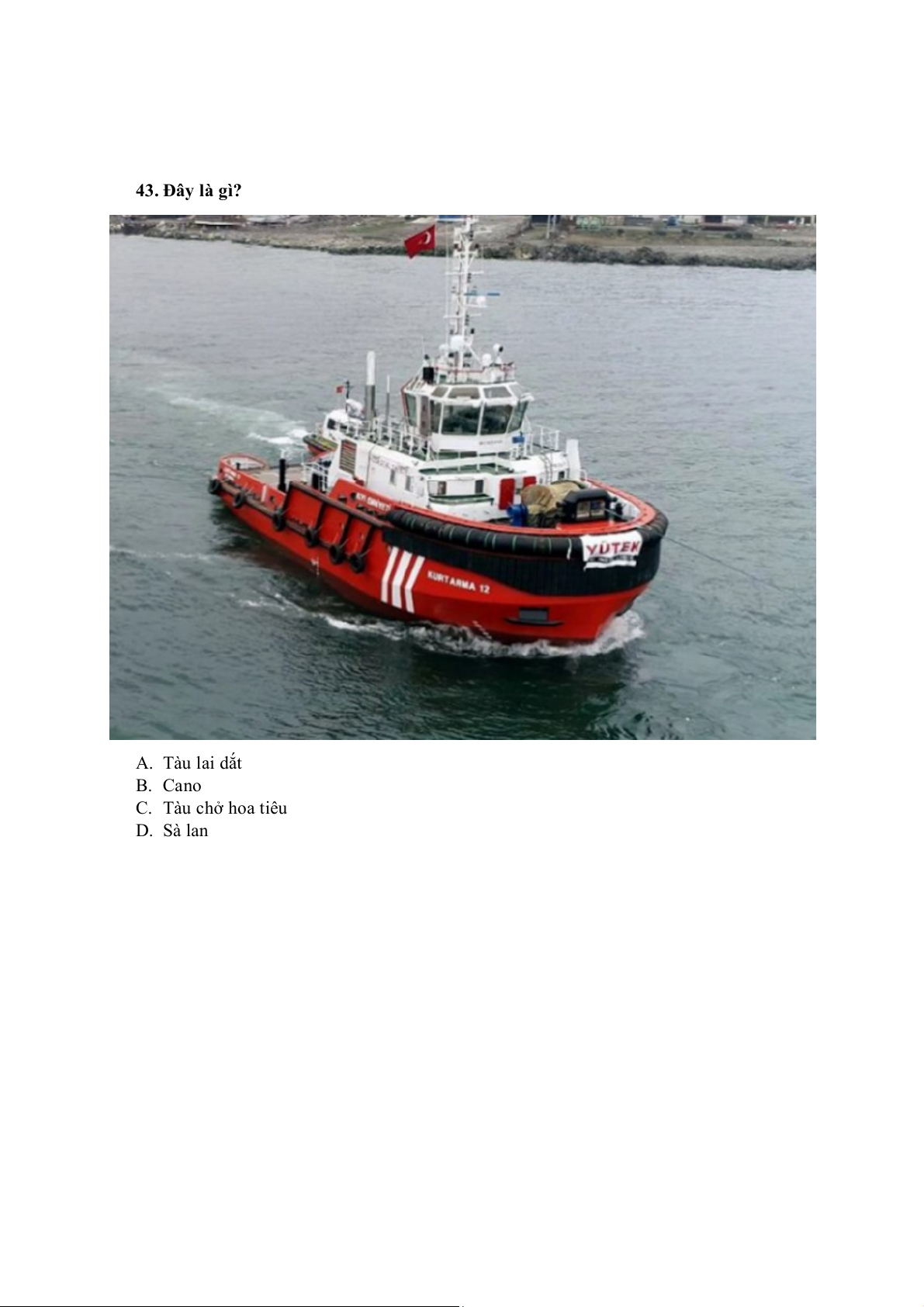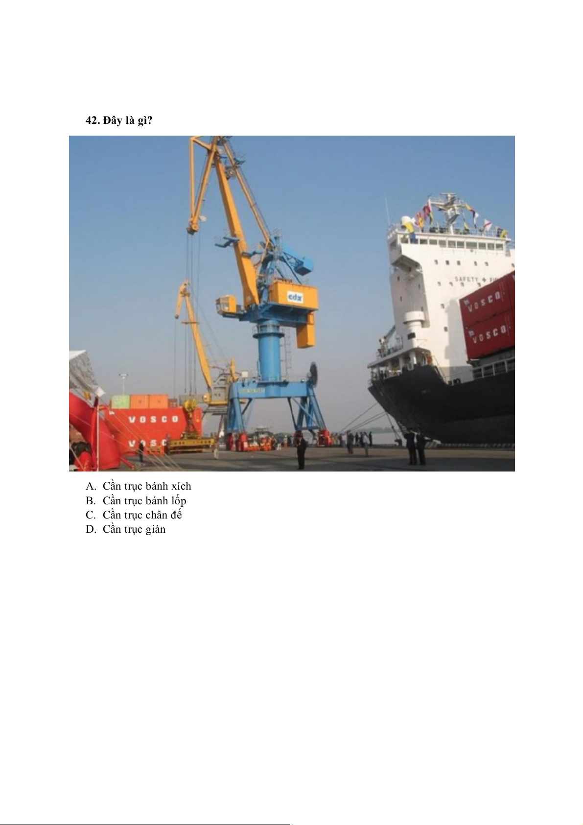 E. 1224$ (10*0.0031+8*0.0025)*12000*2 F. 612$ G. 1080$ H. 0,045$ 42. Đây là gì? A. Cần trục bánh xích B. Cần trục bánh lốp C. Cần trục chân đế D. Cần trục giàn 43. Đây là gì? A. Tàu lai dắt B. Cano C. Tàu chở hoa tiêu D. Sà lan
