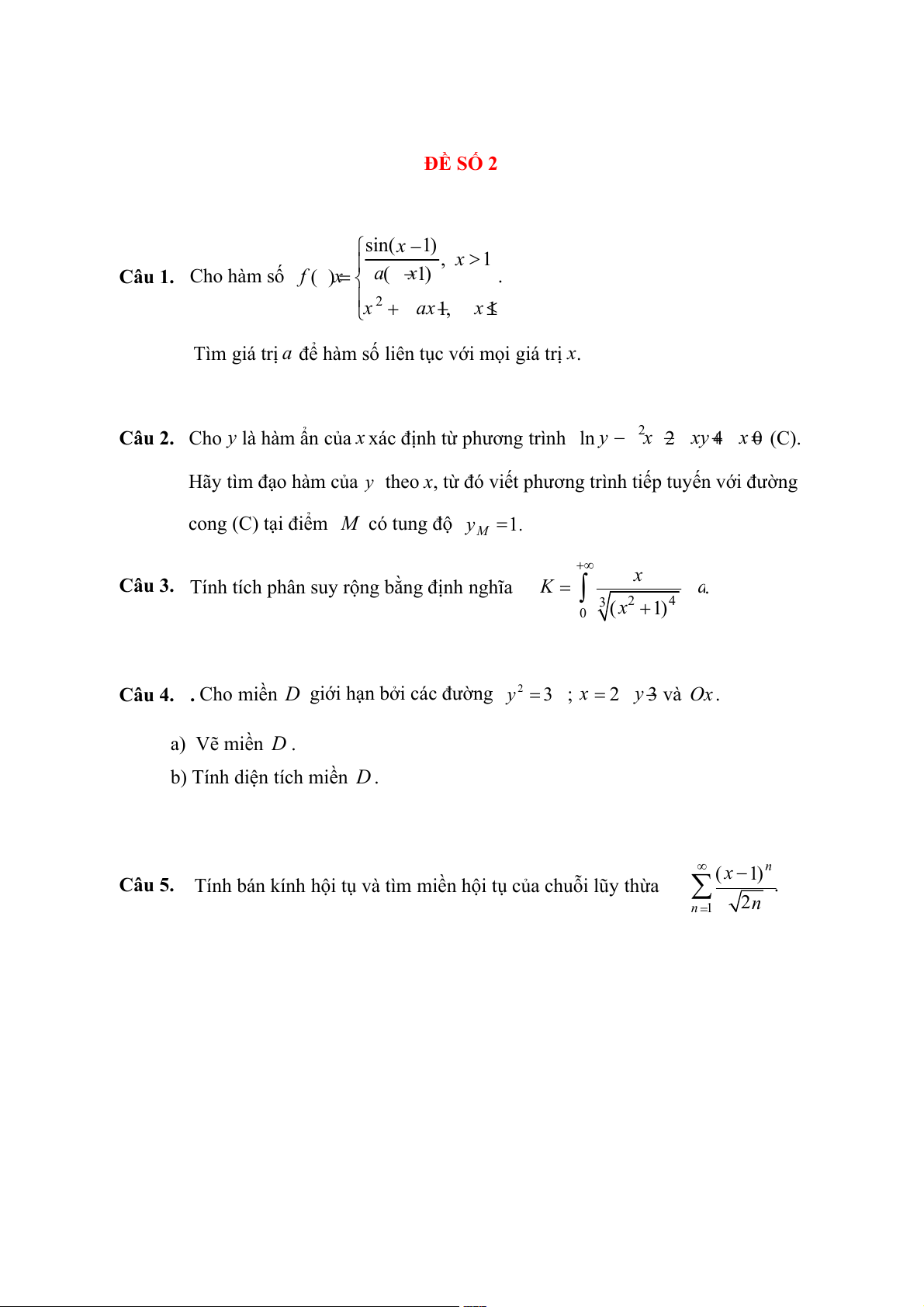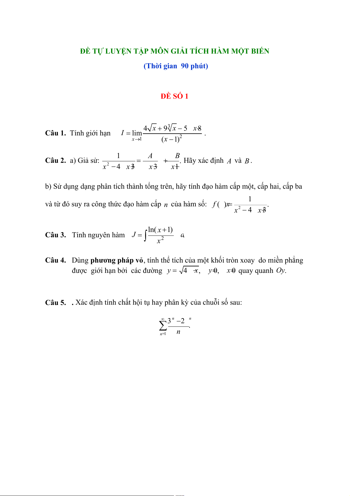 ĐỀ TỰ LUYỆN TẬP MÔN GIẢI TÍCH HÀM MỘT BIẾN