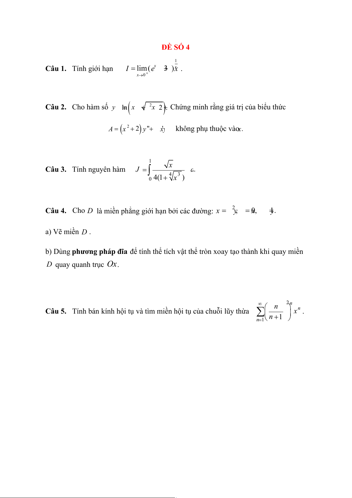 b) Từ đó xét tính hội tụ của chuỗi số. ĐỀ SỐ 4 1