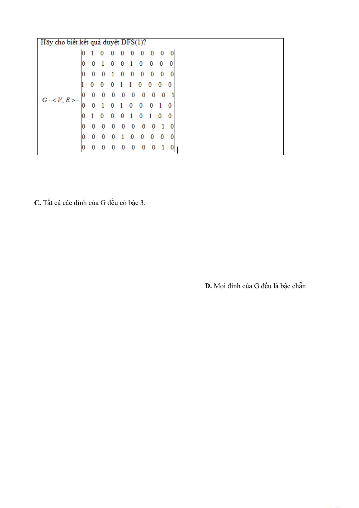 Câu 11. Cho đồ thị G = dưới dạng ma trận kề. 0 1 0 1 0 0 0 0 0 0 1 0 1 0 0 1 1 0 0 0 0 1 0 1 0 1 1 0 0 0 1 0 1 0 1 1 0 0 0 0 0 0 0 1 0 1 0 0 1 1