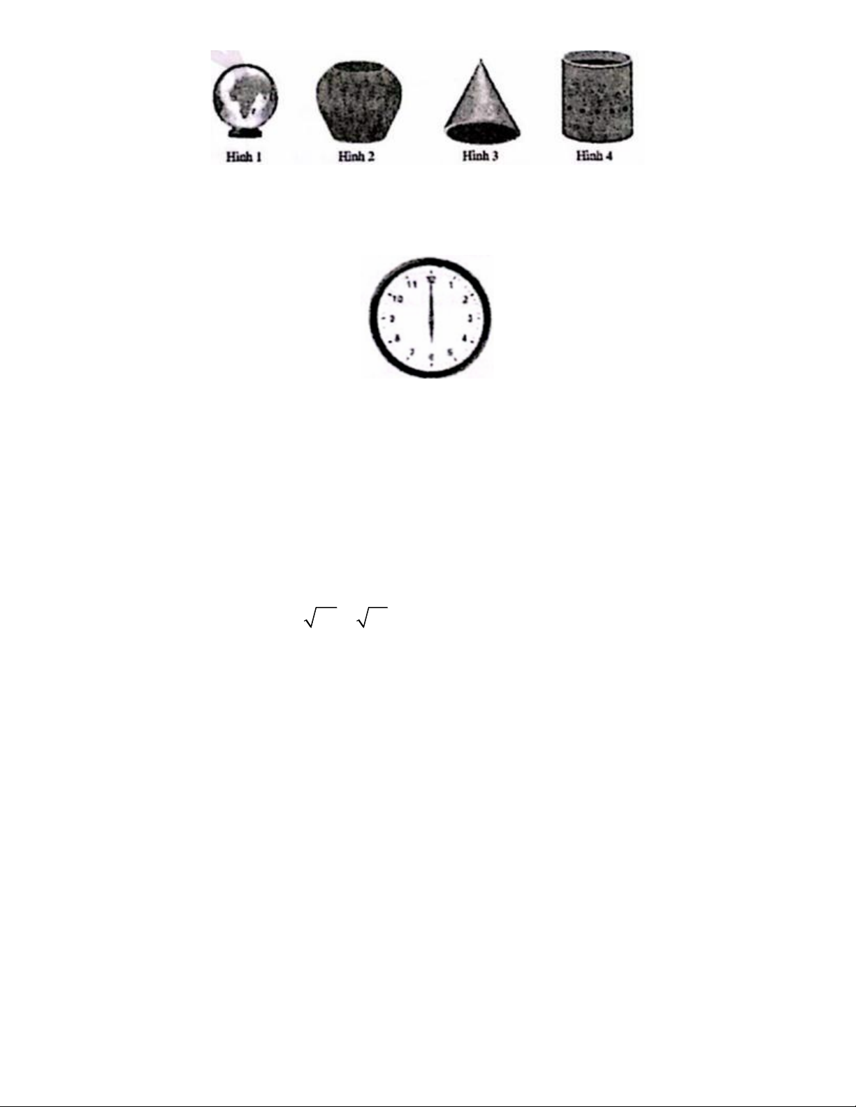 Câu 9. Trong những đồ vật có hình dưới đây, đồ vật nào có dạng hình nón? Trang 1 A. Hình 1 B. Hình 2 C. Hình 3 D. Hình 4