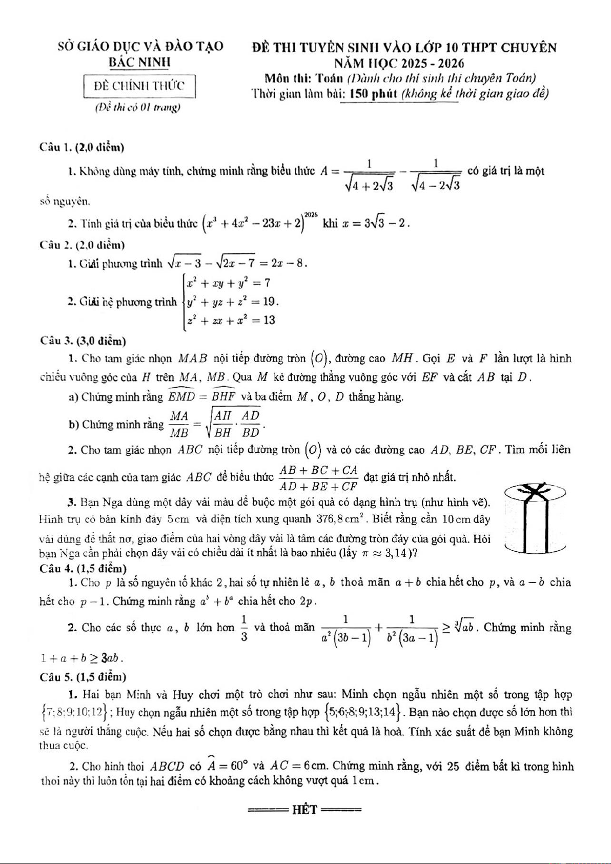 Giới thiệu đến quý thầy, cô giáo và các em học sinh đề chính thức kỳ thi tuyển sinh vào lớp 10 THPT chuyên môn Toán (chuyên) năm học 2025 – 2026 sở Giáo dục và Đào tạo tỉnh Bắc Ninh.