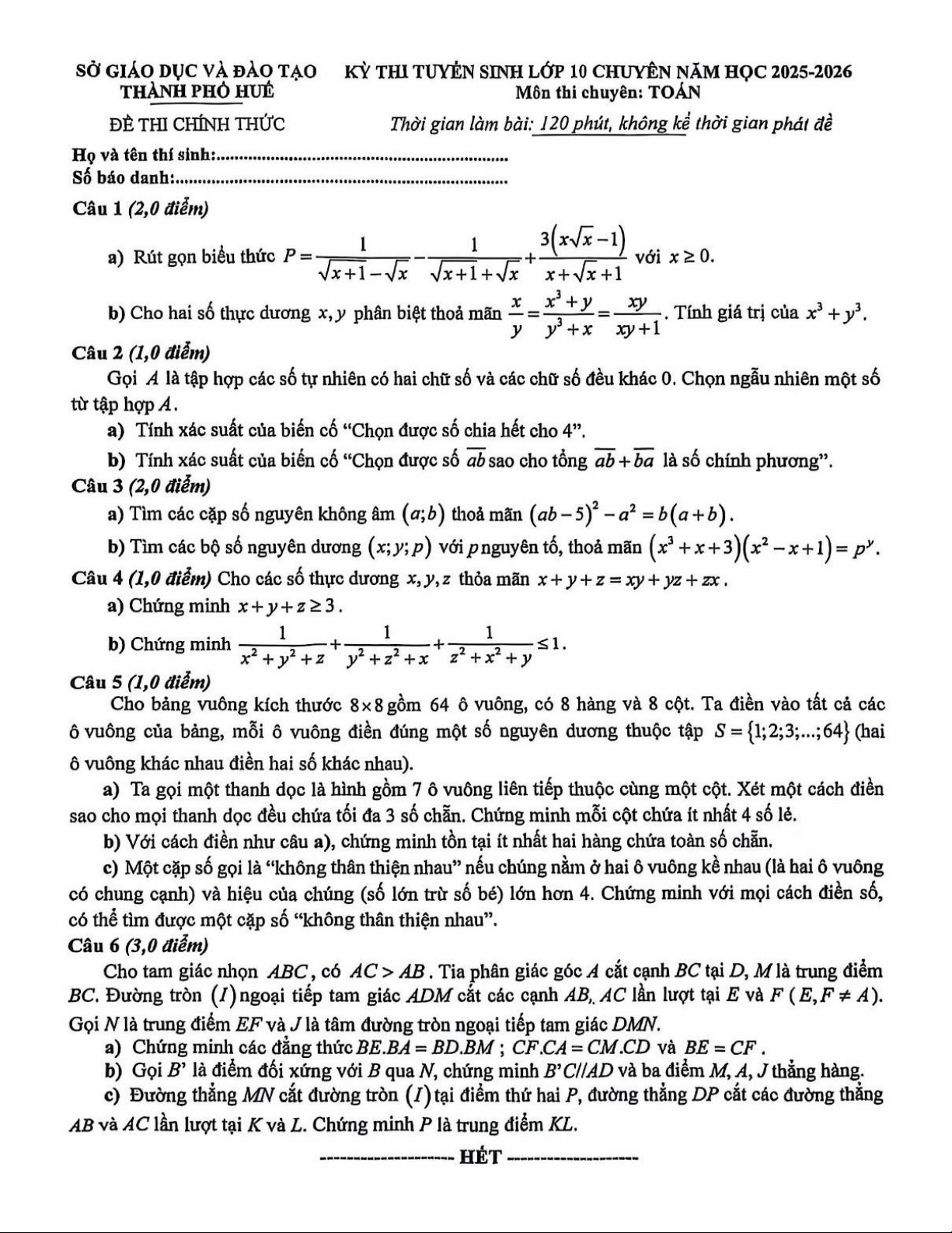Đề tuyển sinh lớp 10 chuyên môn Toán năm 2025 – 2026 sở GD&ĐT Huế