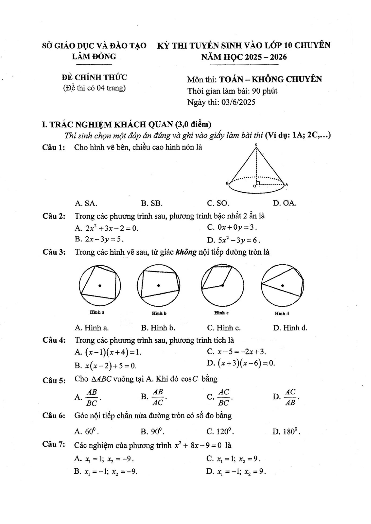 Giới thiệu đến quý thầy, cô giáo và các em học sinh đề chính thức kỳ thi tuyển sinh vào lớp 10 chuyên môn Toán (không chuyên) năm học 2025 – 2026 sở Giáo dục và Đào tạo tỉnh Lâm Đồng. Đề thi gồm 04 trang, hình thức 30% trắc nghiệm khách quan kết hợp 70% tự luận, thời gian làm bài 90 phút. Kỳ thi được diễn ra vào ngày 03 tháng 06 năm 2025.