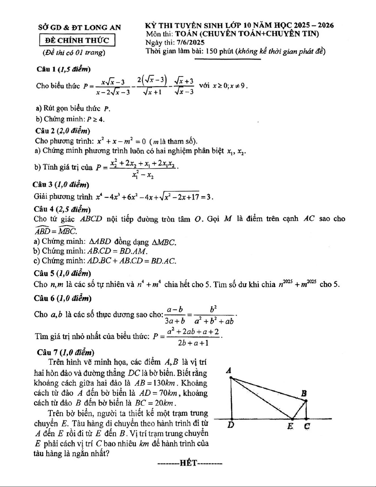 Giới thiệu đến quý thầy, cô giáo và các em học sinh đề chính thức kỳ thi tuyển sinh vào lớp 10 môn Toán (chuyên Toán + chuyên Tin học) năm học 2025 – 2026 sở Giáo dục và Đào tạo tỉnh Long An. Kỳ thi được diễn ra vào ngày 07 tháng 06 năm 2025.