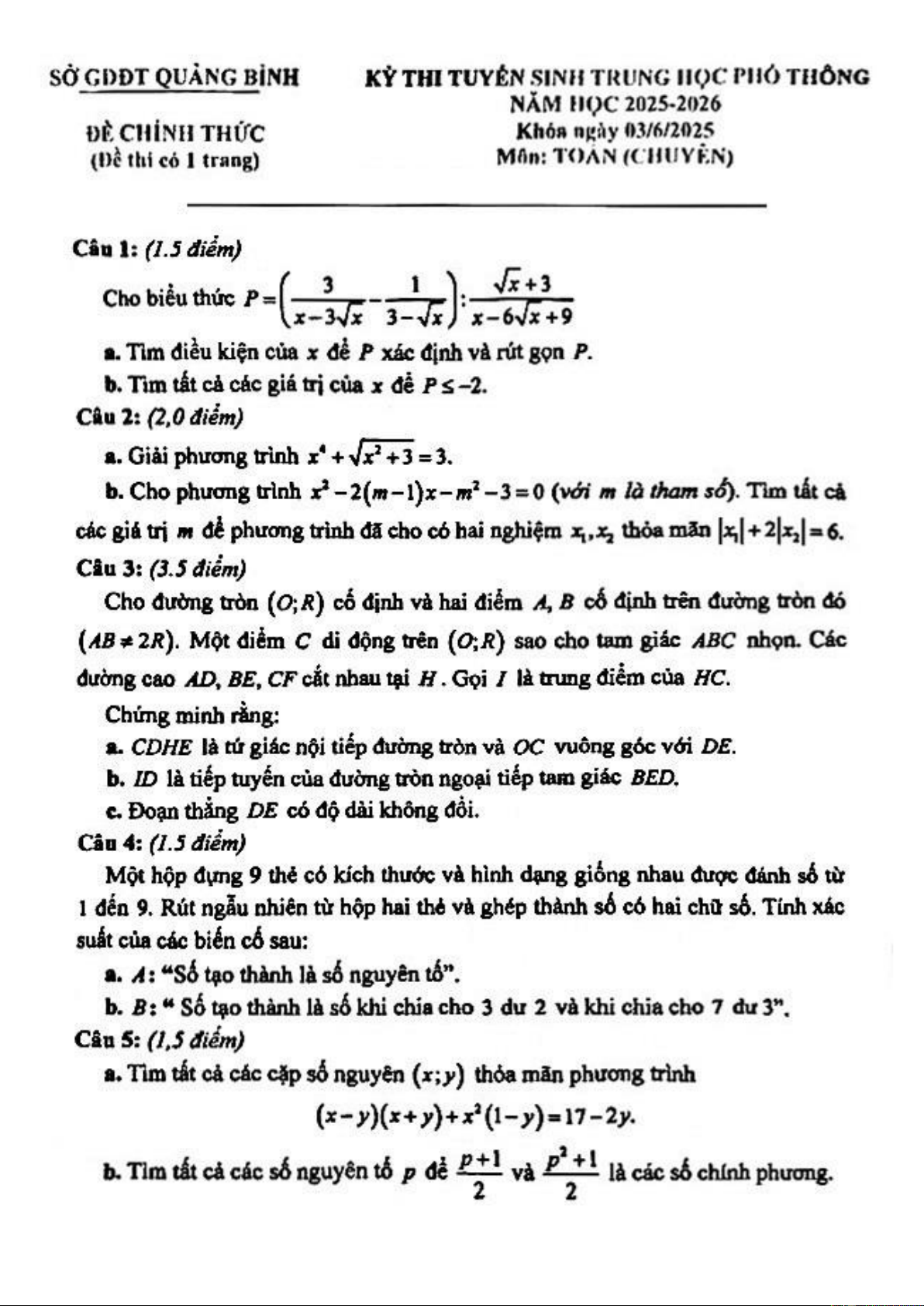 KỲ THI TUYỂN SINH TRUNG HỌC PHỔ THÔNG NĂM HỌC 2025-2026 ĐỀ CHÍNH THỨC ĐỀ THI MÔN TOÁN(CHUYÊN)