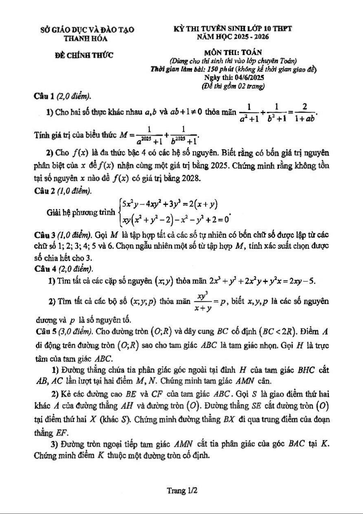 HƯỚNG DẪN GIẢI ĐỀ THI CHUYÊN TOÁN TỈNH THANH HOÁ Năm học 2025 – 2026 Câu 1. 1) Ta có: 1 1 2 ( 2 2 a b 2 1 )( ab) 2( 2 a )( 1 2 b ) 1 2 a 1 2 b 1 1 ab Suy ra ( 2 2 a b 2 1 )( ab) 2( 2 a )( 1 2 b ) 1 ab( 2 2 a b 2) 2 2 2 2 2 a b a b ( 2 2 a b )(ab ) 1 2ab 1 ( ab) 0 (ab )( 1 a b)2 0.