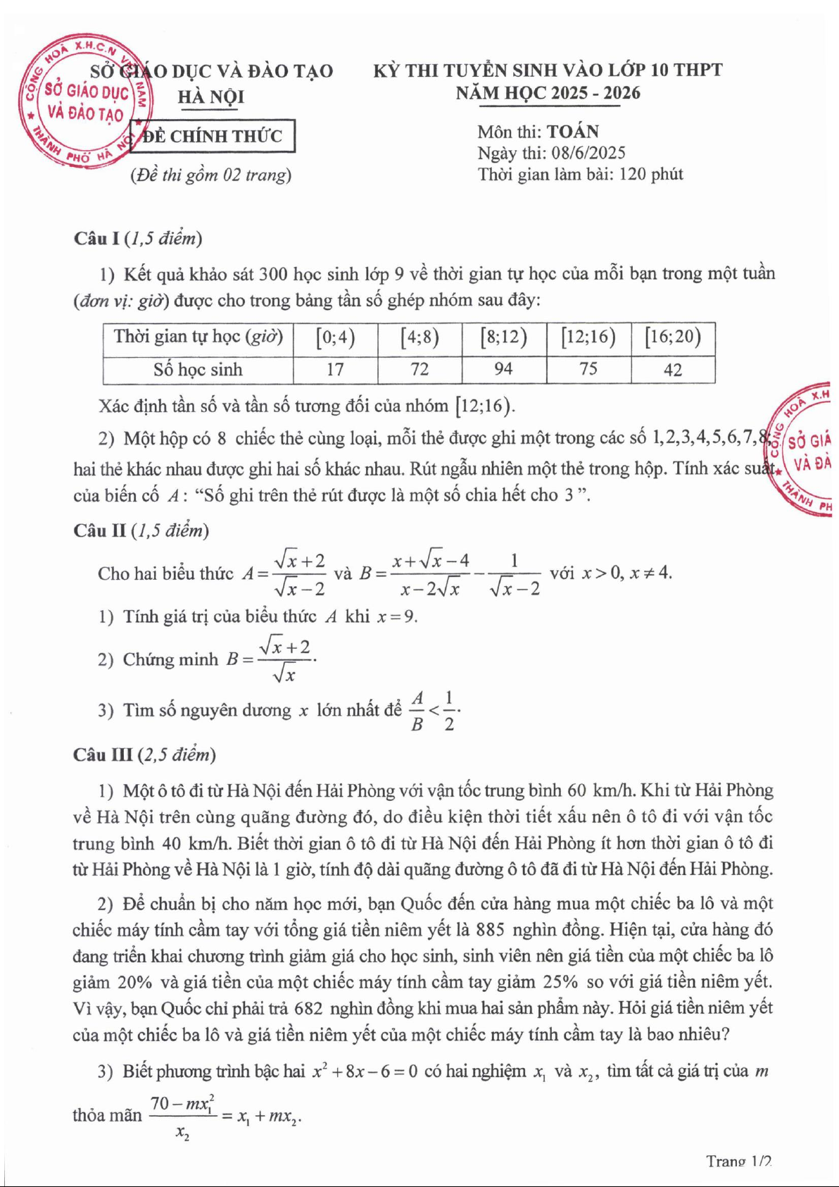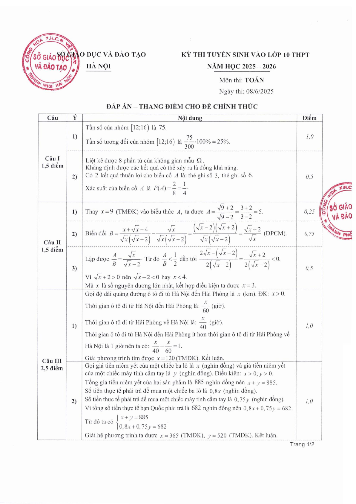 Đề tuyển sinh lớp 10 môn Toán năm 2025 – 2026 sở GD&ĐT Hà Nội