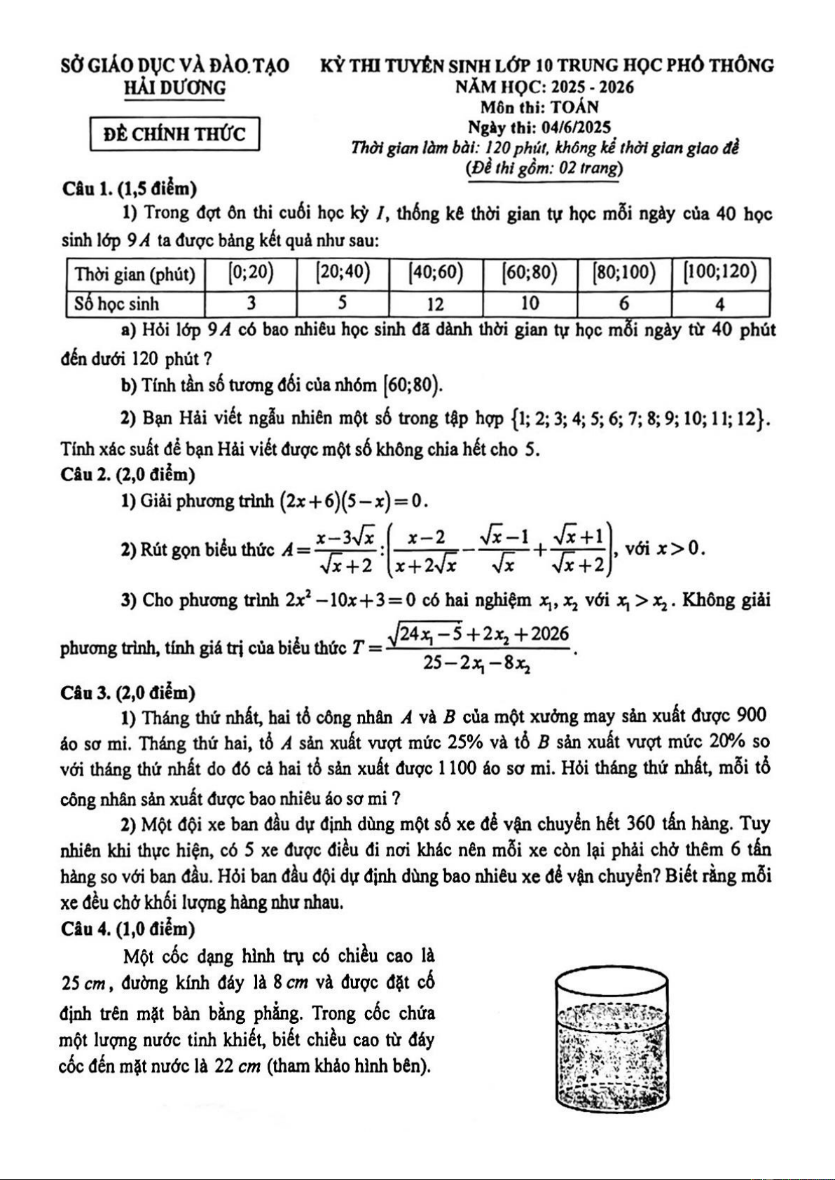 TỈNH HẢI DƯƠNG NĂM HỌC 2025 -2026 Câu 1: (1,5 điểm)