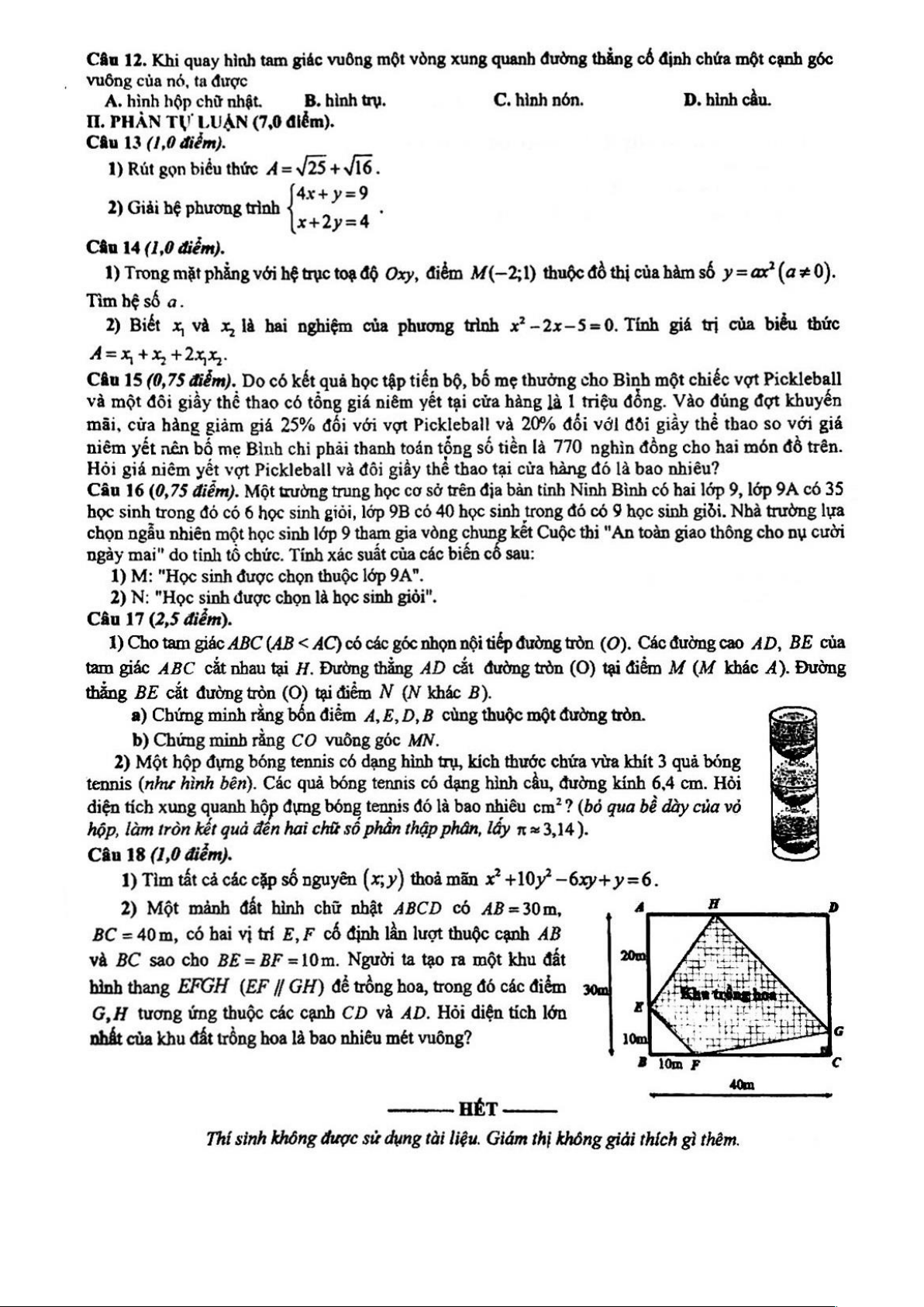 Câu 16: (0,75 điểm) Một trường trung học cơ sở trên địa bàn tỉnh Ninh Bình có hai lớp 9, lớp