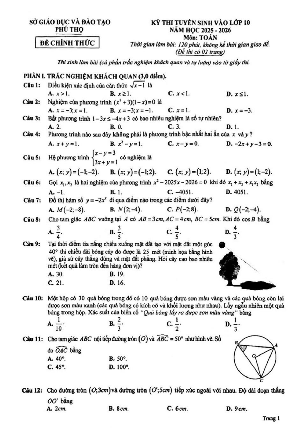 Giới thiệu đến quý thầy, cô giáo và các em học sinh đề chính thức kỳ thi tuyển sinh vào lớp 10 môn Toán năm học 2025 – 2026 sở Giáo dục và Đào tạo tỉnh Phú Thọ. Đề thi cấu trúc 30% trắc nghiệm + 70% tự luận, thời gian làm bài 120 phút, có đáp án và lời giải chi tiết.
