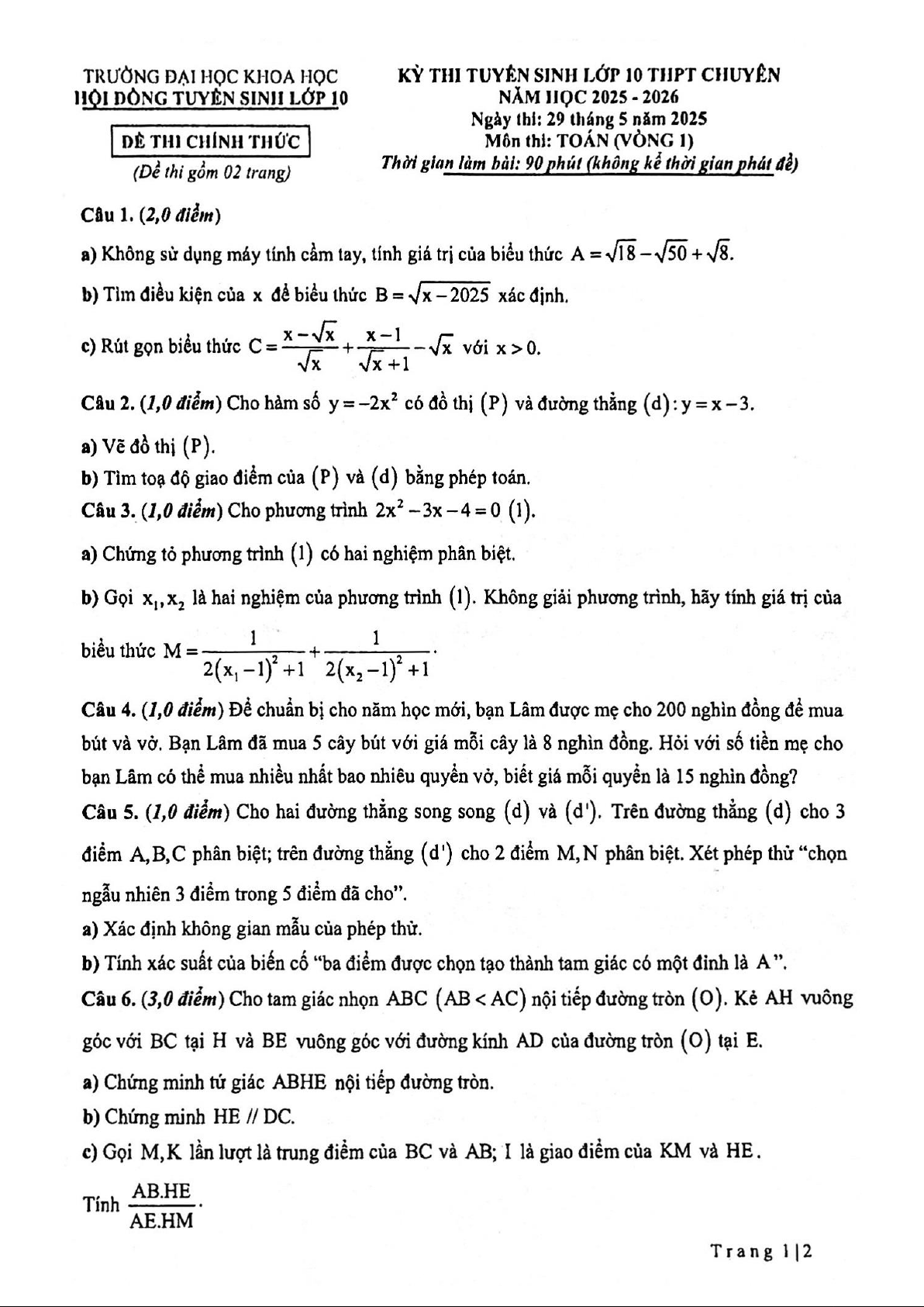 Đề tuyển sinh lớp 10 môn Toán (vòng 1) năm 2025 – 2026 trường THPT chuyên Khoa học Huế