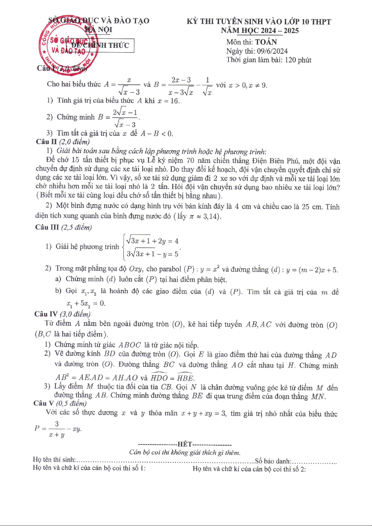 Giới thiệu đến quý thầy, cô giáo và các em học sinh lớp 9 đề chính thức kỳ thi tuyển sinh vào lớp 10 THPT môn Toán năm học 2024 – 2025 sở Giáo dục và Đào tạo thành phố Hà Nội; kỳ thi được diễn ra vào sáng Chủ Nhật ngày 09 tháng 06 năm 2024.