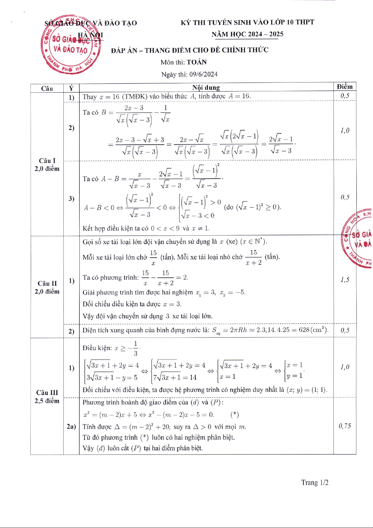 Đề tuyển sinh lớp 10 THPT môn Toán năm 2024 – 2025 sở GD&ĐT Hà Nội