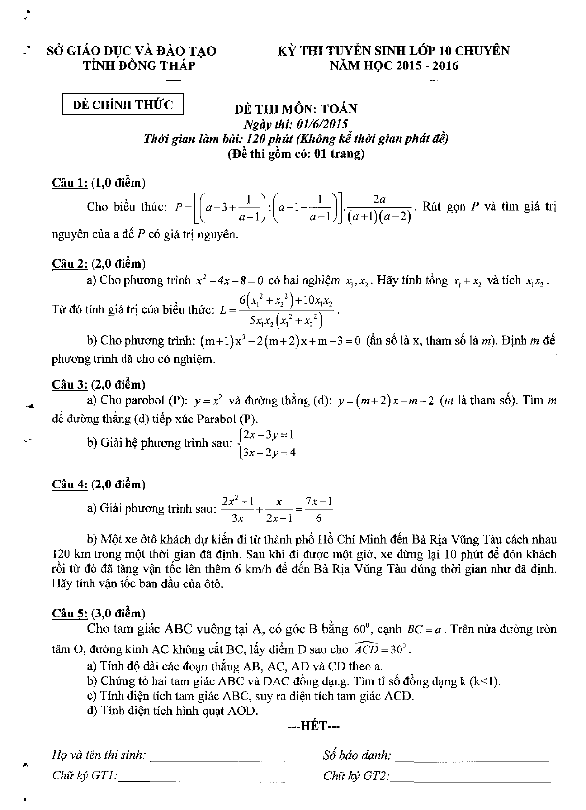 Đề tuyển sinh vào 10 chuyên môn Toán cơ sở năm 2015 – 2016 sở GD&ĐT Đồng Tháp
