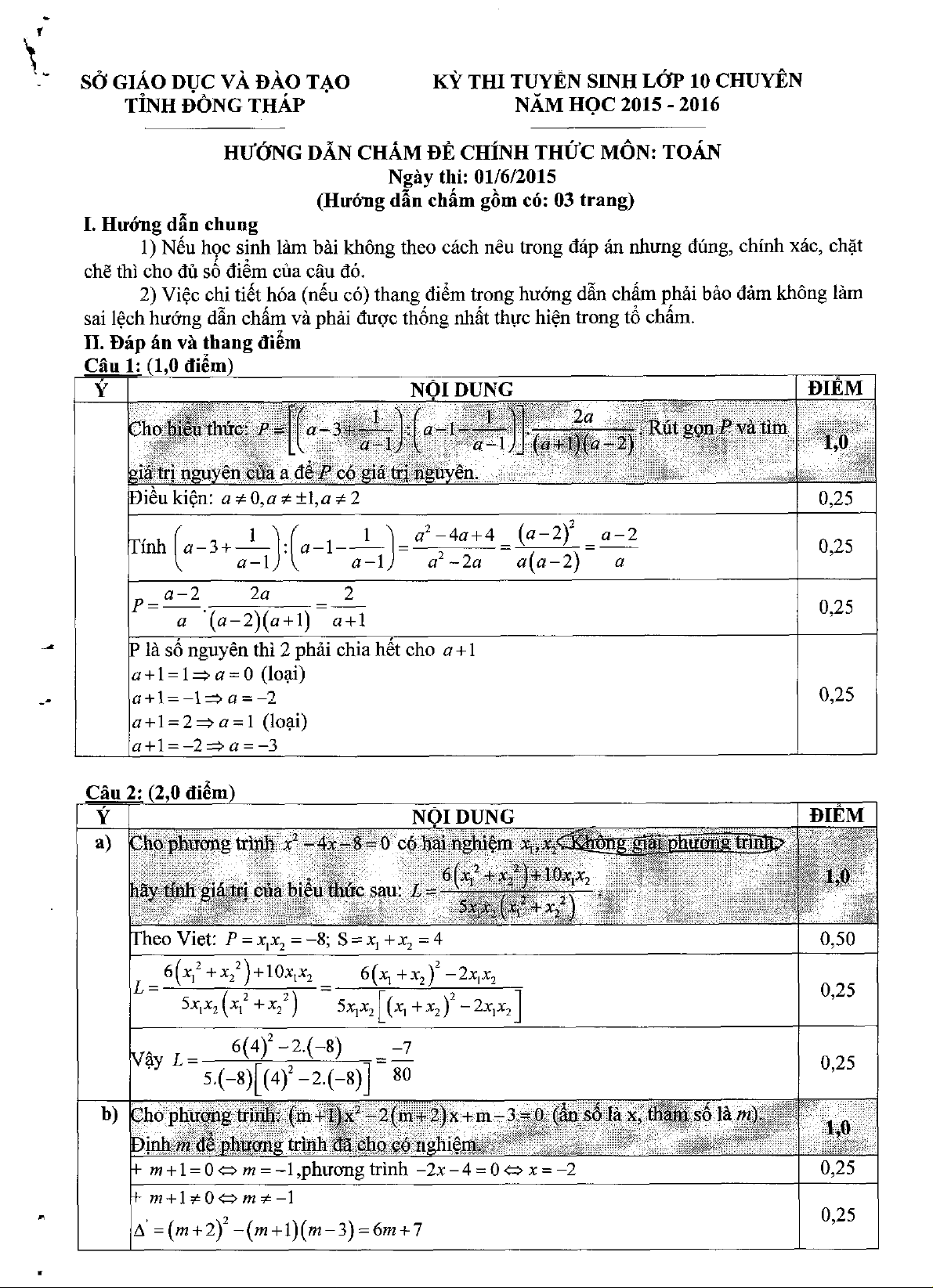 Giới thiệu đến quý thầy, cô giáo và các em học sinh đề thi tuyển sinh vào lớp 10 chuyên môn Toán cơ sở năm học 2015 – 2016 sở Giáo dục và Đào tạo tỉnh Đồng Tháp; kỳ thi được diễn ra vào ngày 01 tháng 06 năm 2015; đề thi có đáp án, lời giải chi tiết và hướng dẫn chấm điểm.