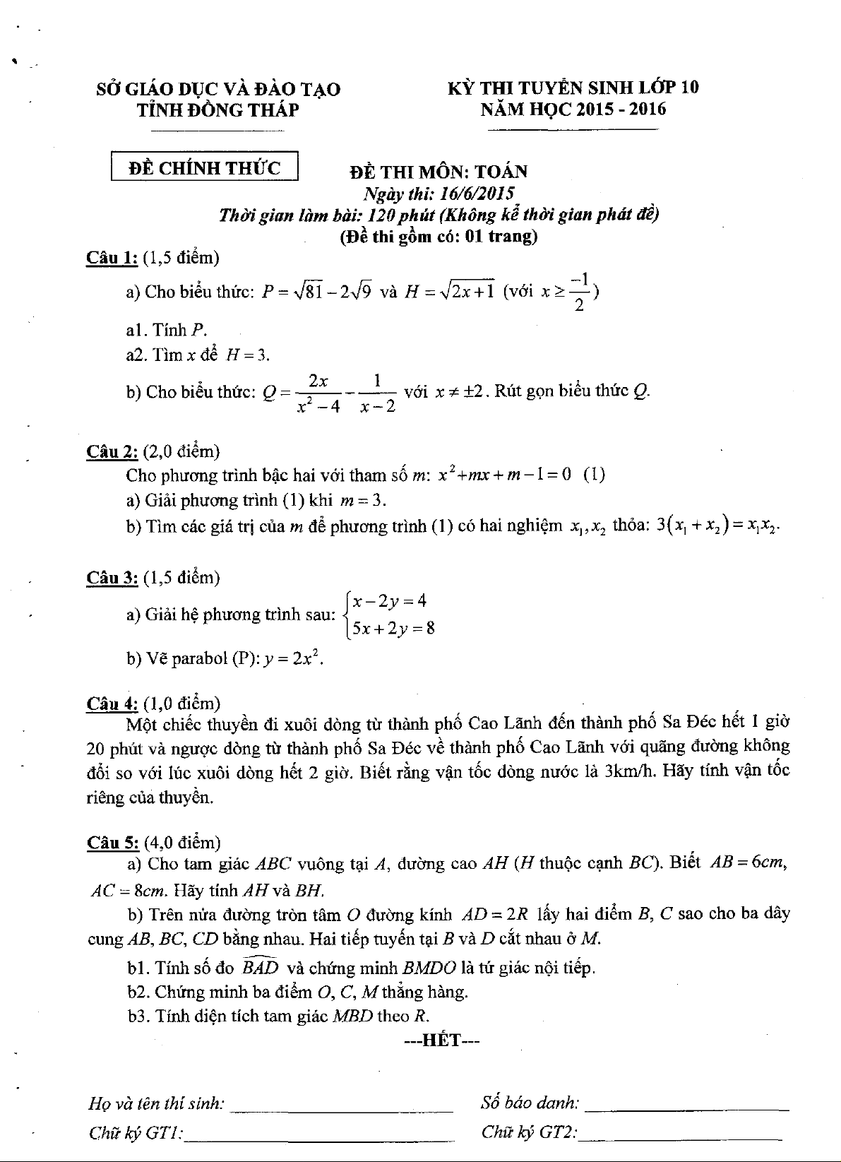 Đề tuyển sinh vào 10 môn Toán năm 2015 – 2016 sở GD&ĐT Đồng Tháp