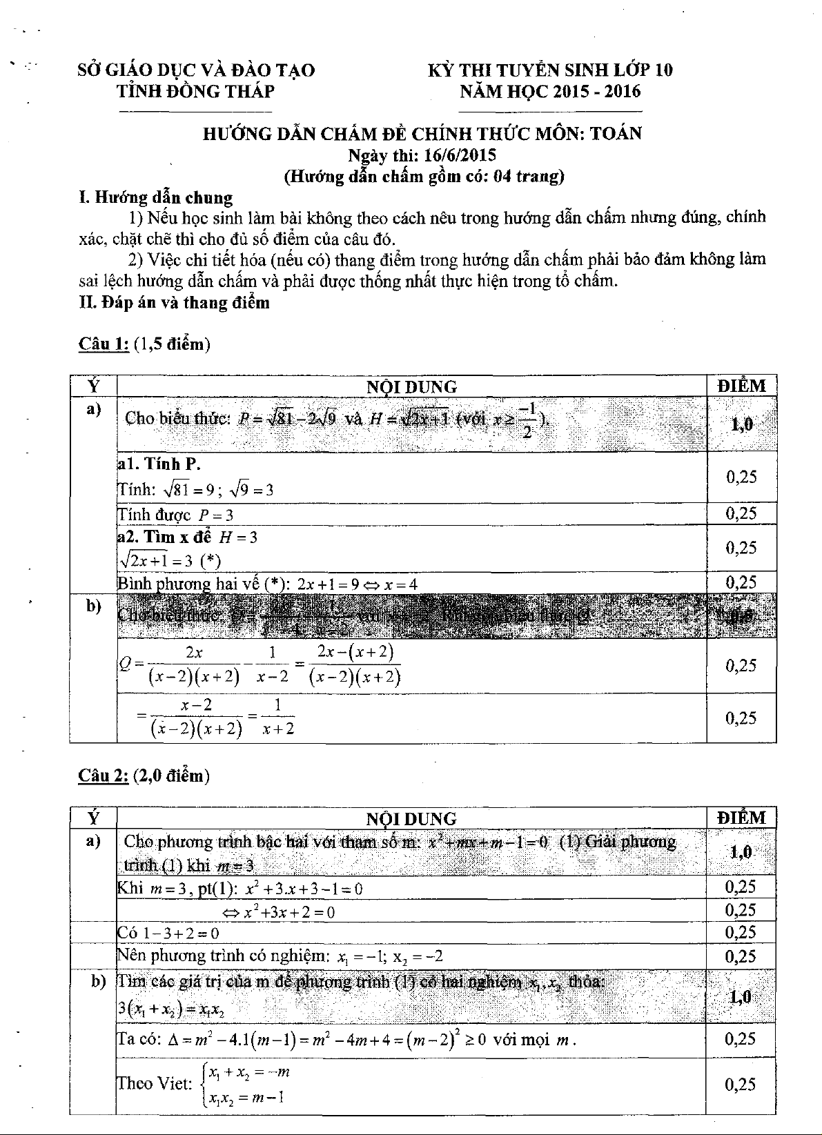 Giới thiệu đến quý thầy, cô giáo và các em học sinh đề thi tuyển sinh vào lớp 10 môn Toán năm học 2015 – 2016 sở Giáo dục và Đào tạo tỉnh Đồng Tháp; kỳ thi được diễn ra vào ngày 16 tháng 06 năm 2015; đề thi có đáp án, lời giải chi tiết và hướng dẫn chấm điểm.