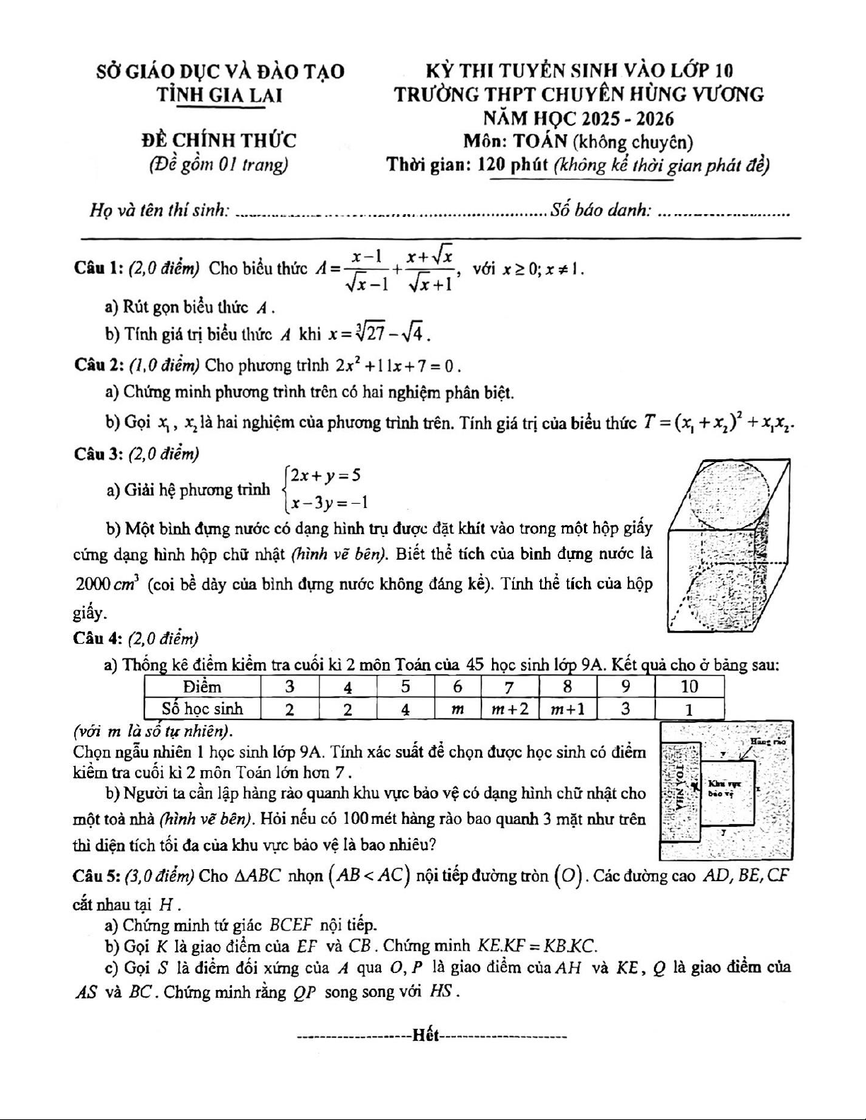 Giới thiệu đến quý thầy, cô giáo và các em học sinh đề chính thức kỳ thi tuyển sinh vào lớp 10 môn Toán (không chuyên) năm học 2025 – 2026 trường THPT chuyên Hùng Vương, tỉnh Gia Lai.
