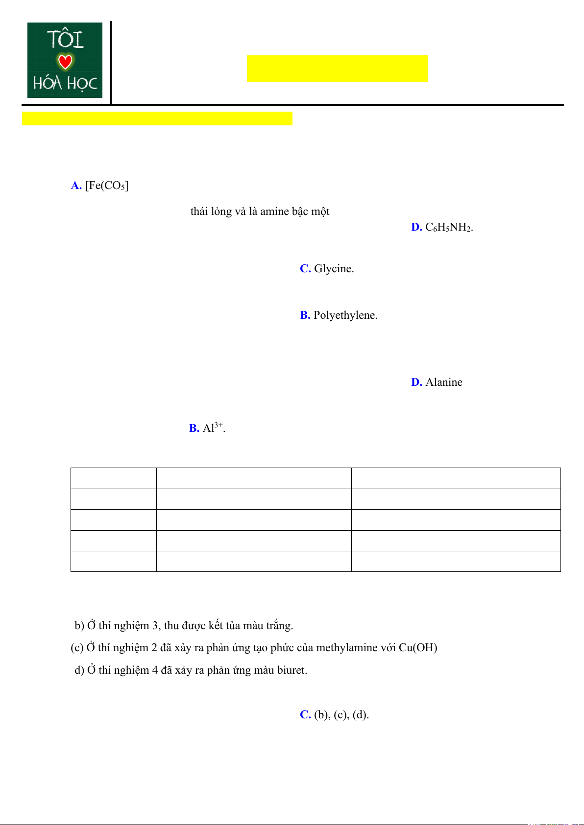 Câu 7: Một học sinh đã tiến hành các thí nghiệm giữa các chất phản ứng và tác nhân phản ứng sau: Thí nghiệm Chất phản ứng Tác nhân phản ứng 1 Dung dịch ethylamine