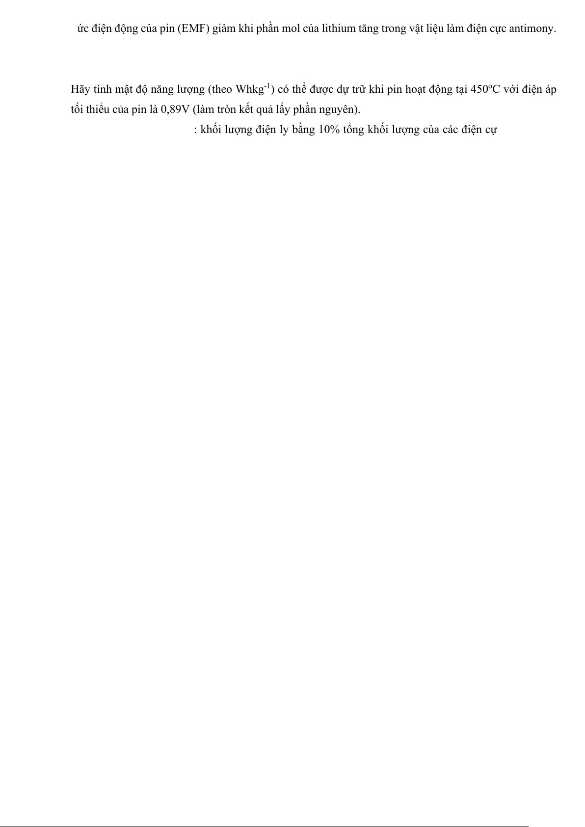 Hãy tính mật độ năng lượng (theo Whkg-1) có thể được dự trữ khi pin hoạt động tại 450oC với điện áp