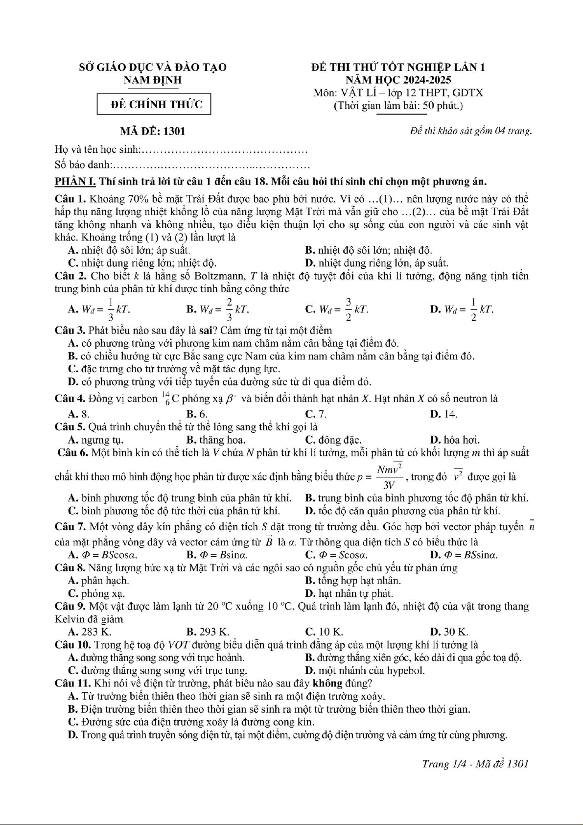 Đề thi thử tốt nghiệp Vật Lý lần 1. Tài liệu được sưu tầm gồm 4 trang. Mời các bạn tham khảo