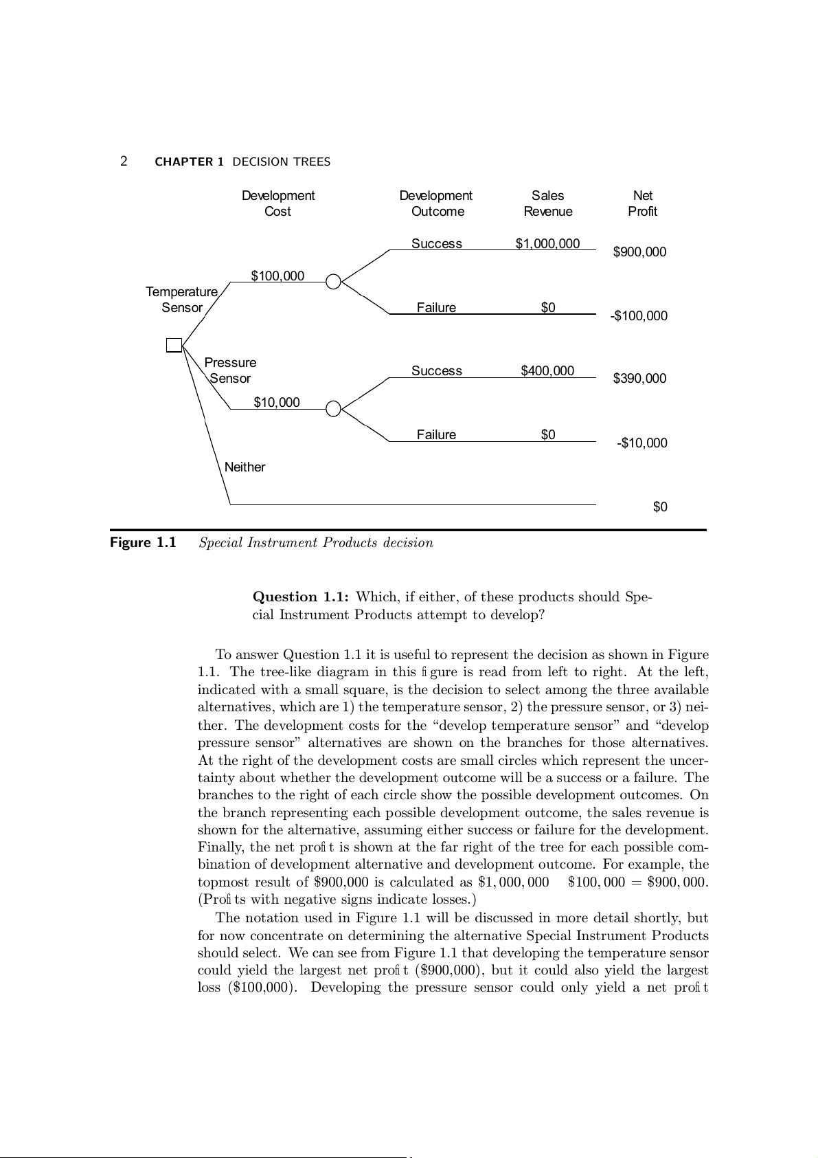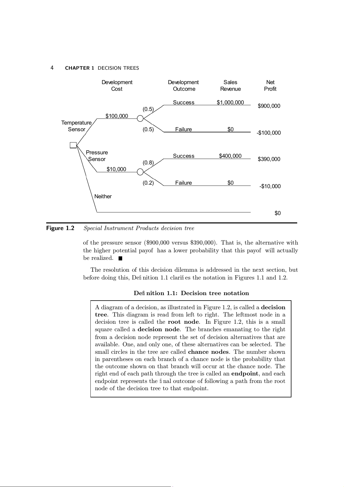the temperature sensor and $10,000 for the pressure sensor. 2 CHAPTER 1 DECISION TREES De e v o l pment De e v o l pment Sales Net Cost Outcome Re e v u n e Profit Succ s e s $1, 0 0 0,000 $ 0 9 0, 0 0 0 $100,000 Tem e p a r ture Sensor F i a lure $0 - 1 $ 00,000 Pressure Succ s e s $ 0 4 0, 0 0 0 Sensor $ 9 3 0, 0 0 0 $10,000 F i a lure $0 - 1 $ 0, 0 0 0 Neither $0 Figure 1.1