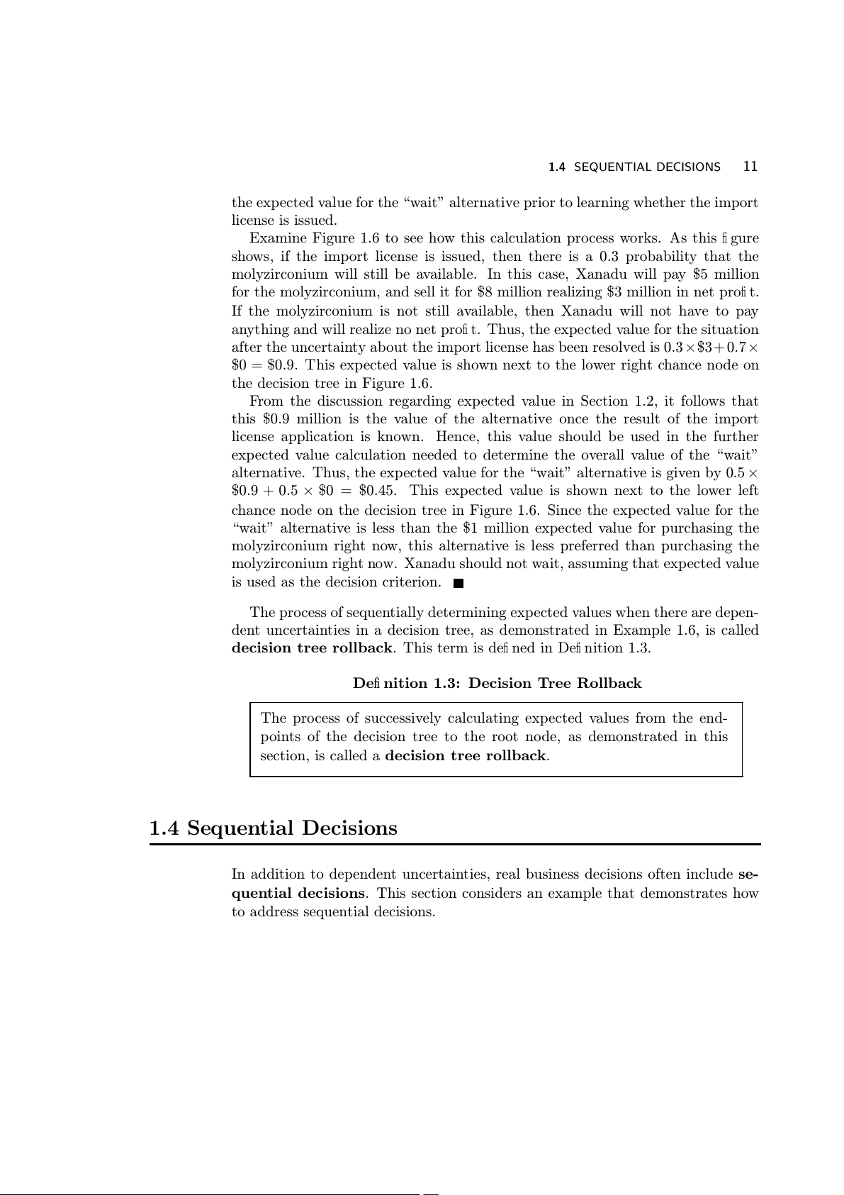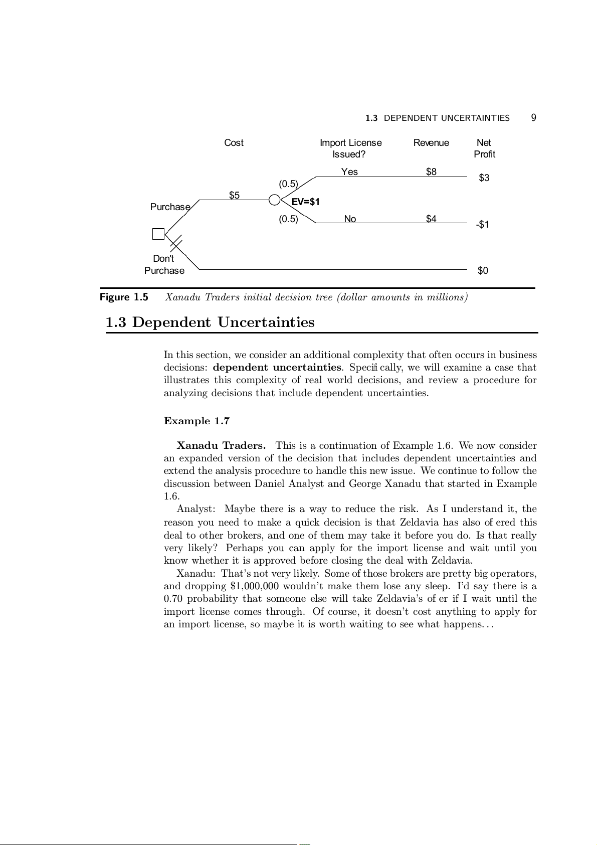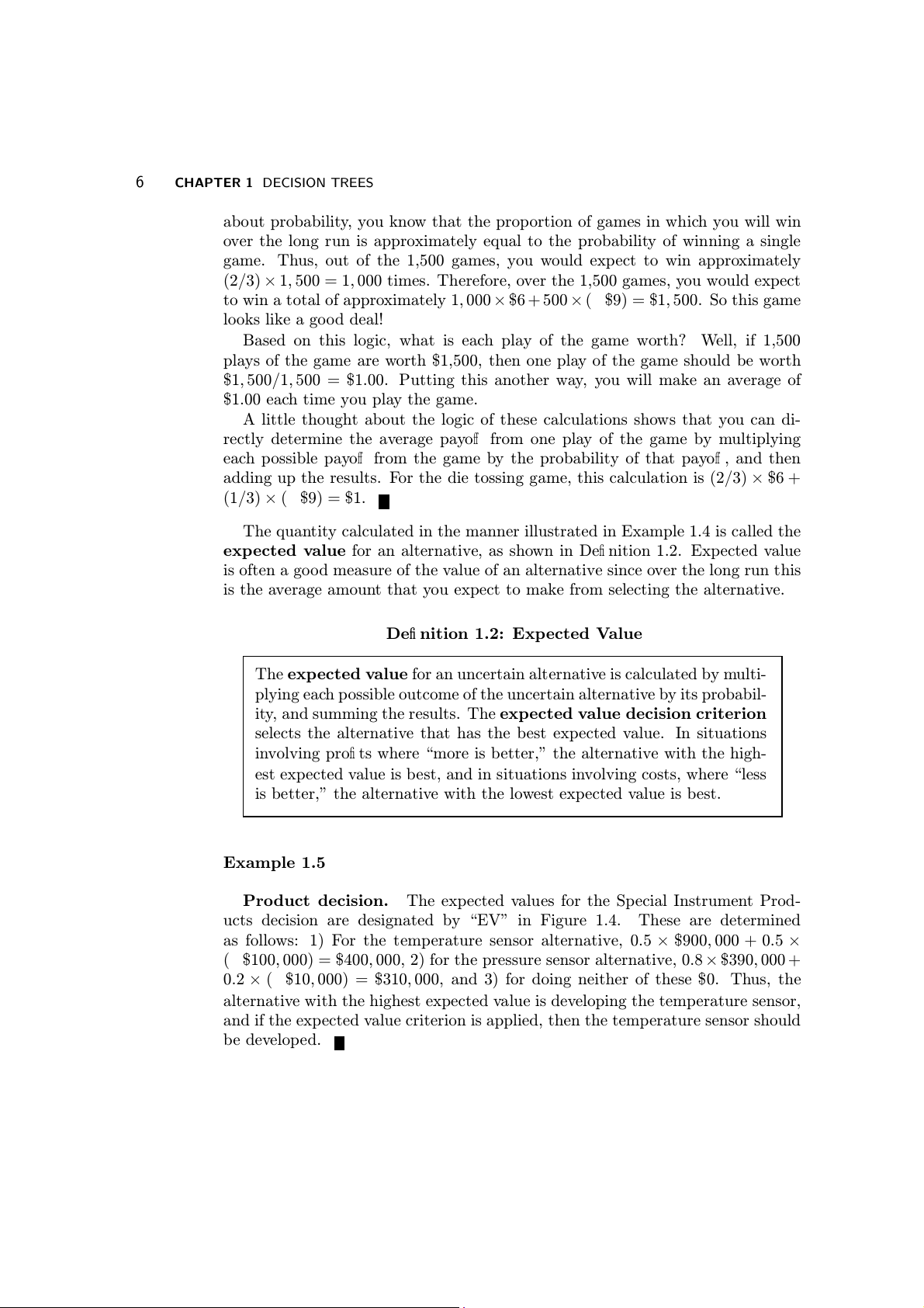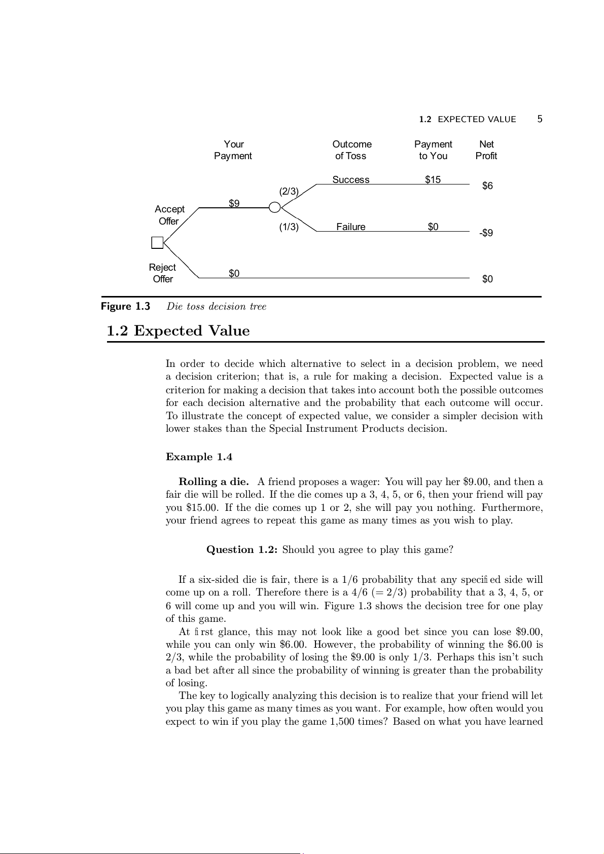 node of the decision tree to that endpoint. 1.2 EXPECTED VALUE 5 Your Outcome Payment Net Payment of Toss to You Profit Succ s e s $15 $6 (2/3) $9 Accept Offer (1/3) F i a lure $0 -$9 Reject $0 Offer $0 Figure 1.3 Die toss decision tree 1.2 Expected Value