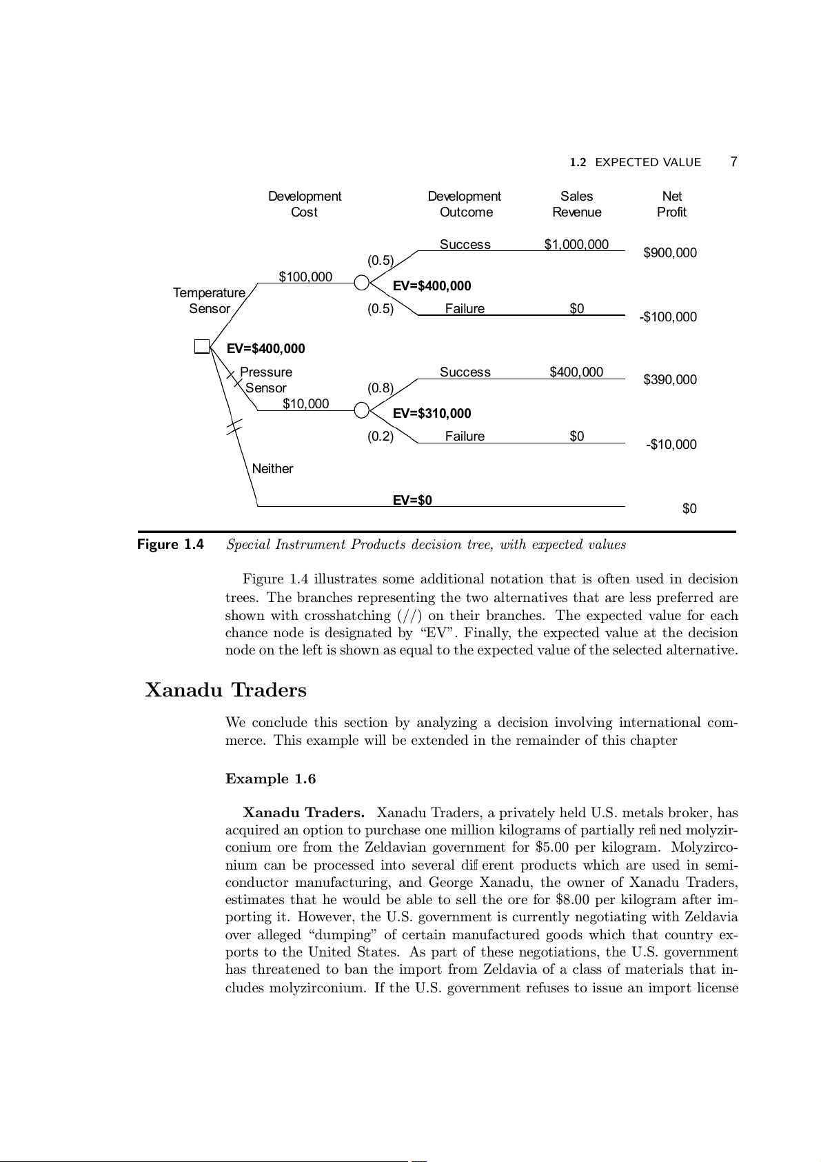 ture sensor is considerably higher than the net pro¯ t from successful development 4 CHAPTER 1 DECISION TREES De e v o l pment De e v o l pment Sales Net Cost Outcome Re e v u n e Profit Succ s e s $1, 0 0 0,000 $ 0 9 0, 0 0 0 (0.5) $100,000 Tem e p a r ture Sensor (0.5) F i a lure $0 - 1 $ 00,000 Pressure Succ s e s $ 0 4 0, 0 0 0 Sensor $ 9 3 0, 0 0 0 (0.8) $10,000 (0.2) F i a lure $0 - 1 $ 0, 0 0 0 Neither $0 Figure 1.2