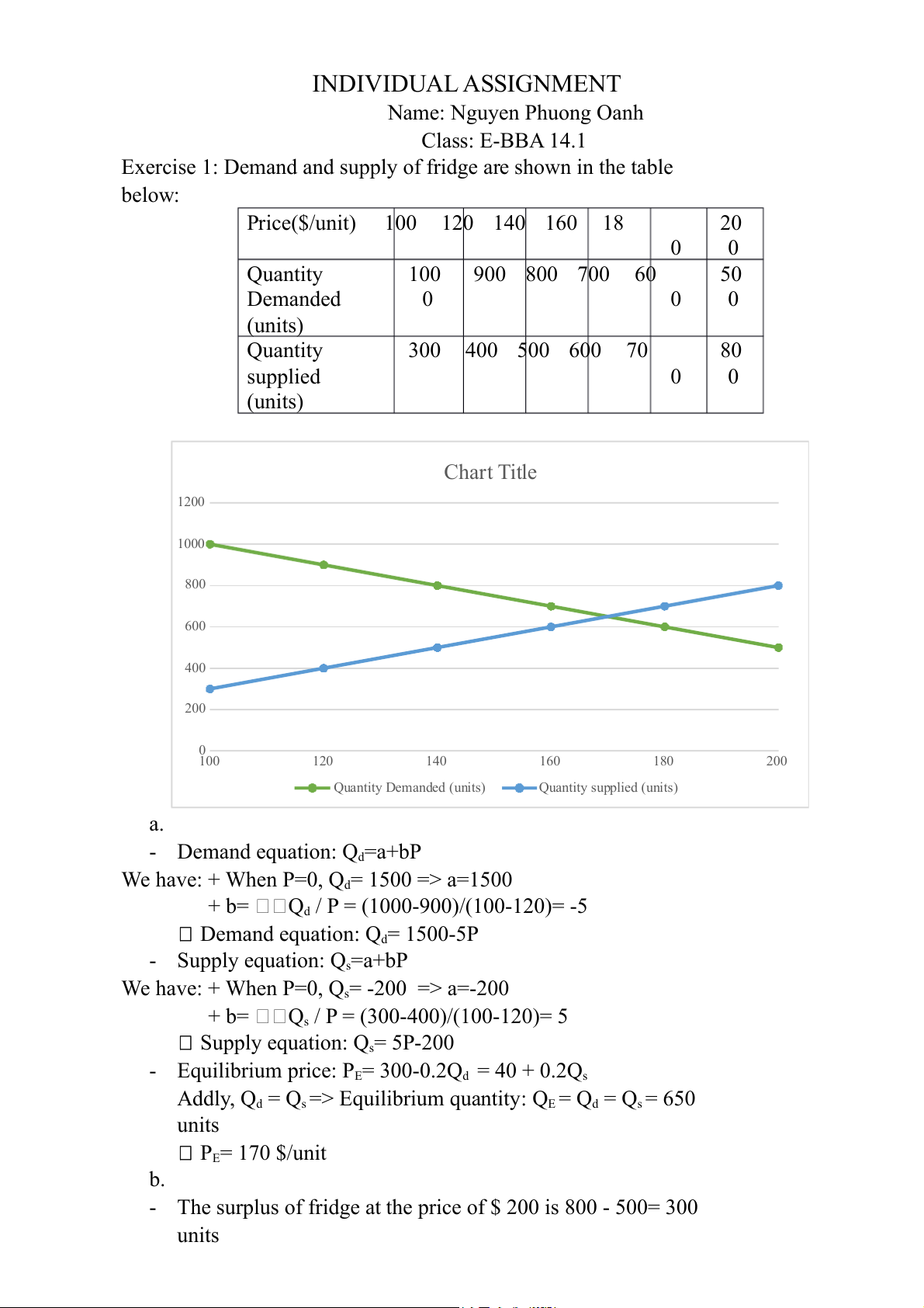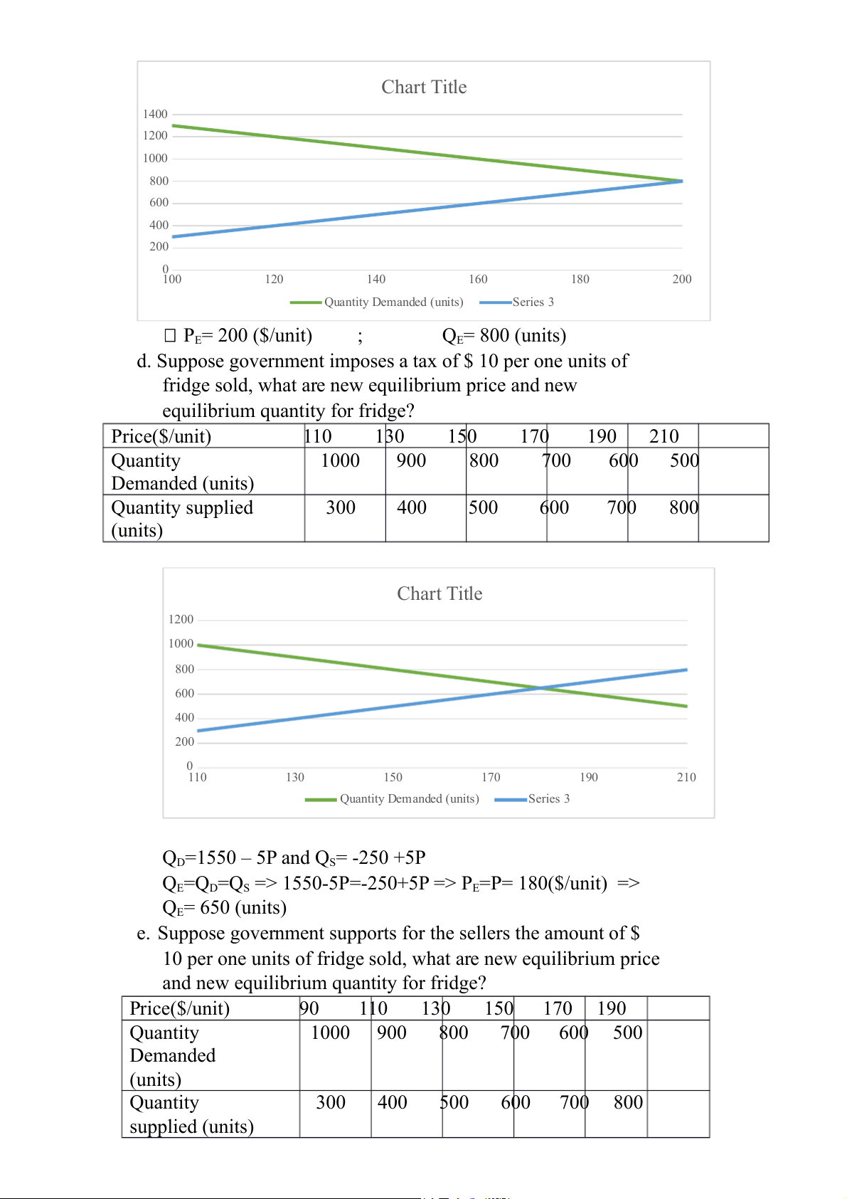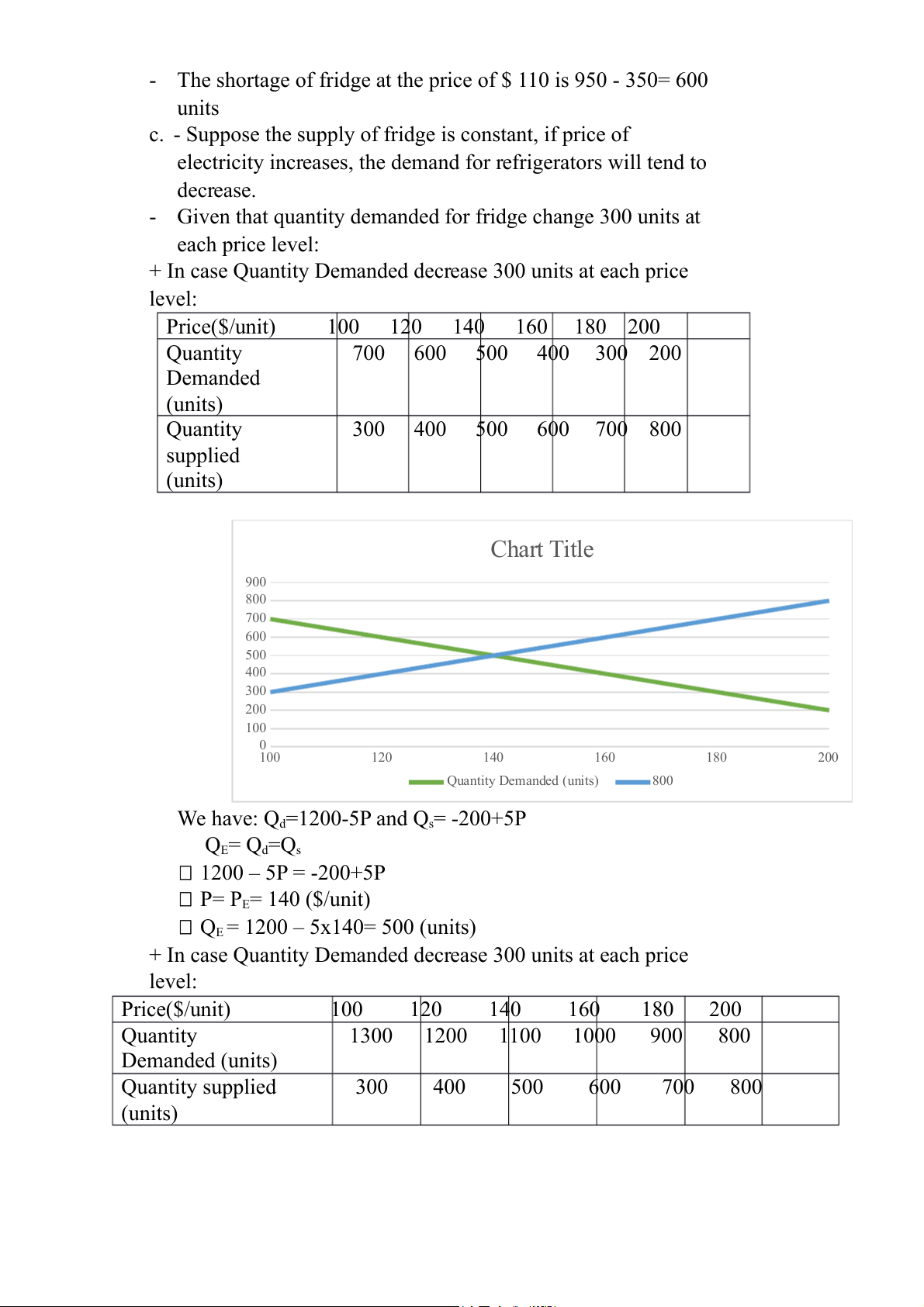 Exercise 1: Demand and supply of fridge are shown in the table below: Price($/unit) 100 120 140 160 18 20 0 0 Quantity 100 900 800 700 60 50 Demanded 0 0 0 (units) Quantity 300 400 500 600 70 80 supplied 0 0 (units) Chart Title 1200 1000 800 600 400 200 0 100 120 140 160 180 200 Quantity Demanded (units) Quantity supplied (units) a. - Demand equation: Qd=a+bP