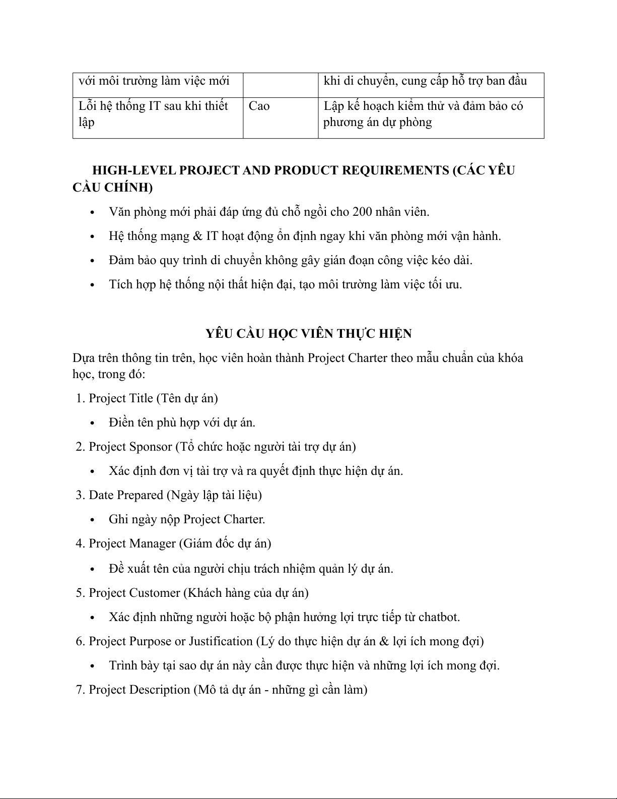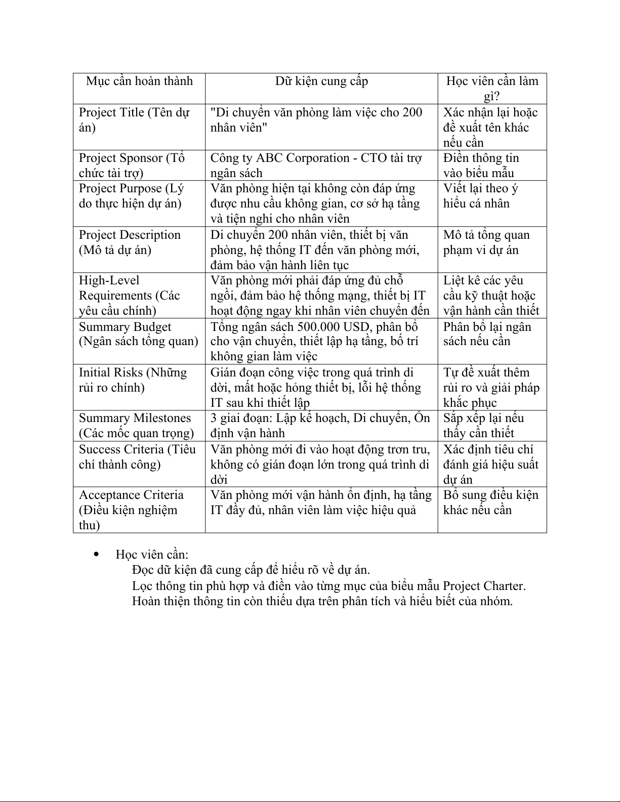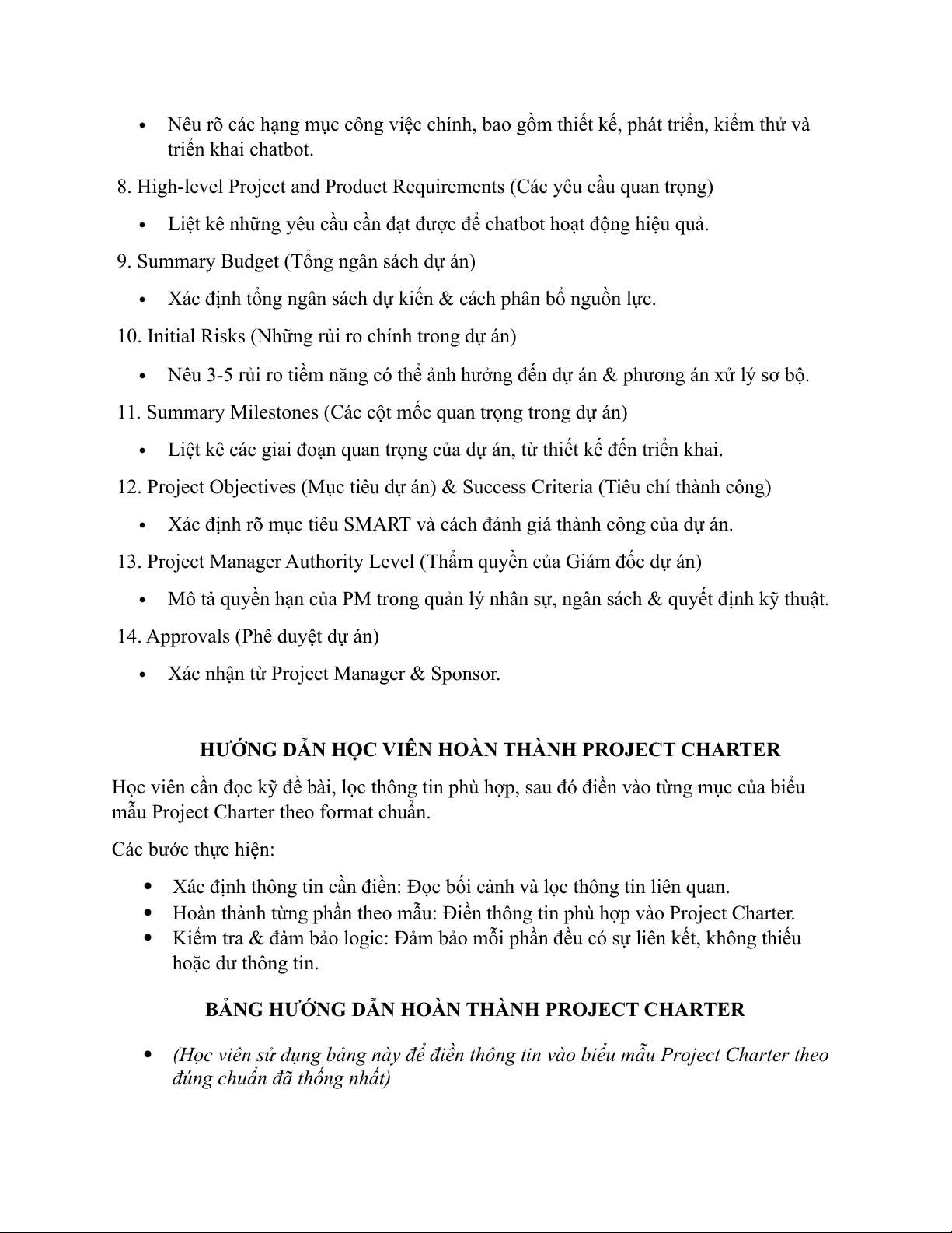 Dựa trên thông tin trên, học viên hoàn thành Project Charter theo mẫu chuẩn của khóa học, trong đó: