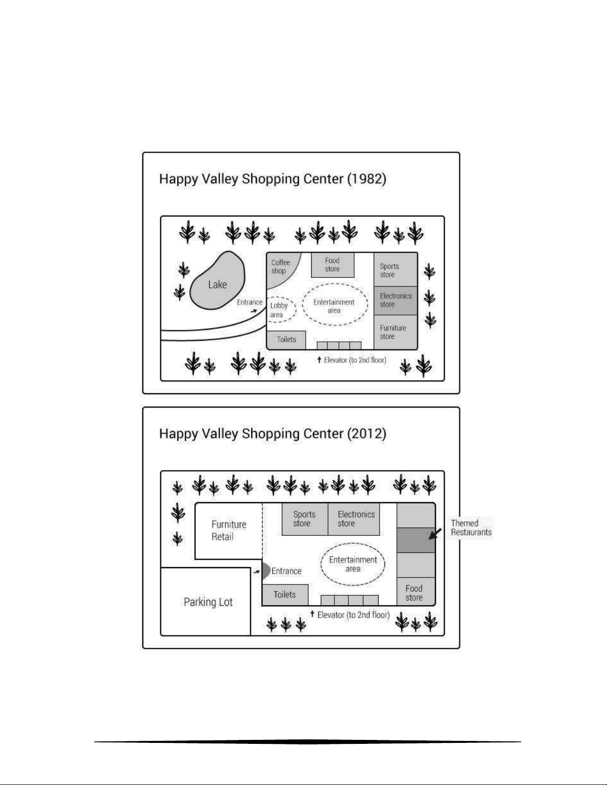 The diagrams below show changes in Happy Valley Shopping Centre in 1982 and 2012.