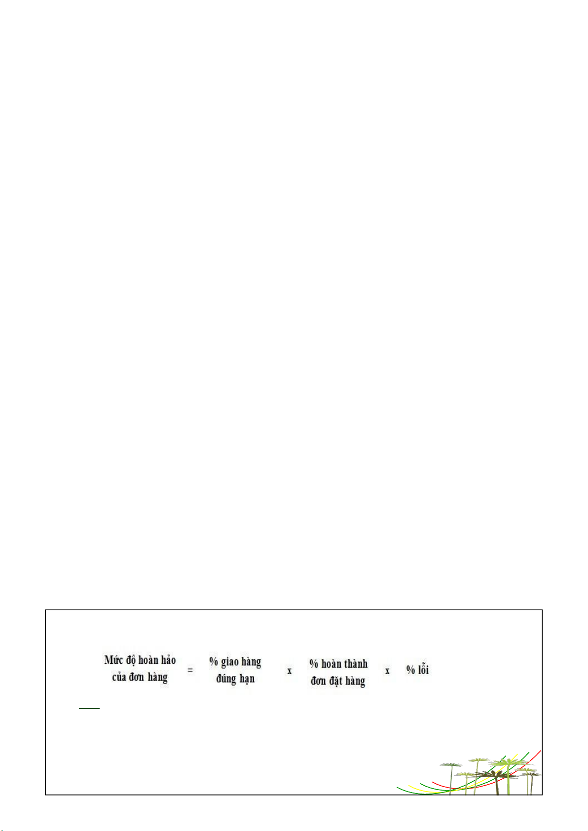 - Tốc độ hiệu suất.: Khỏang thời gian thực hiện một đơn đặt hàng tính từ khi khách hàng trao đơn đặt