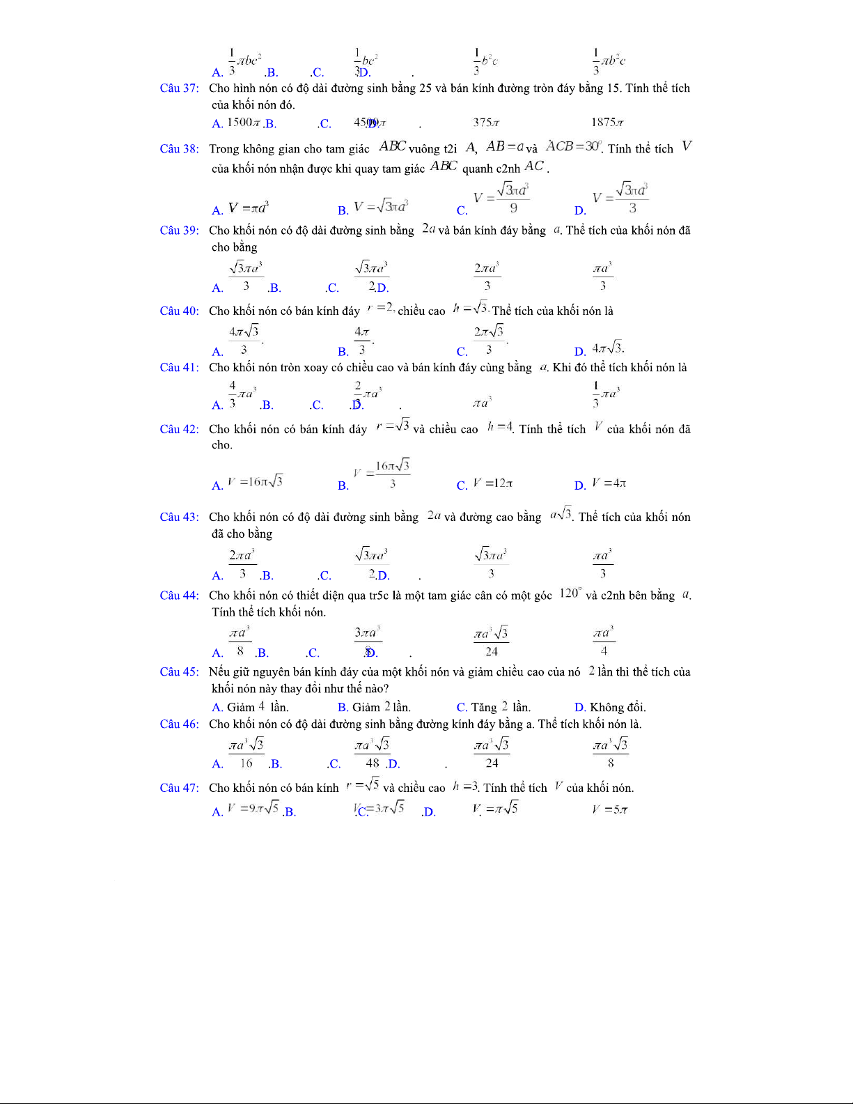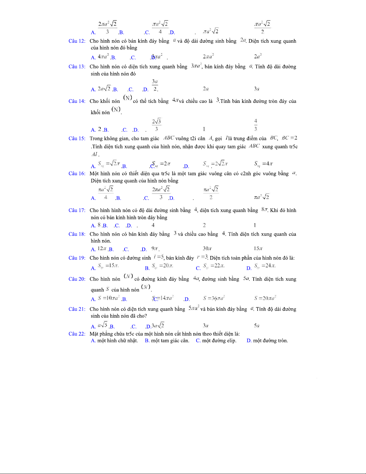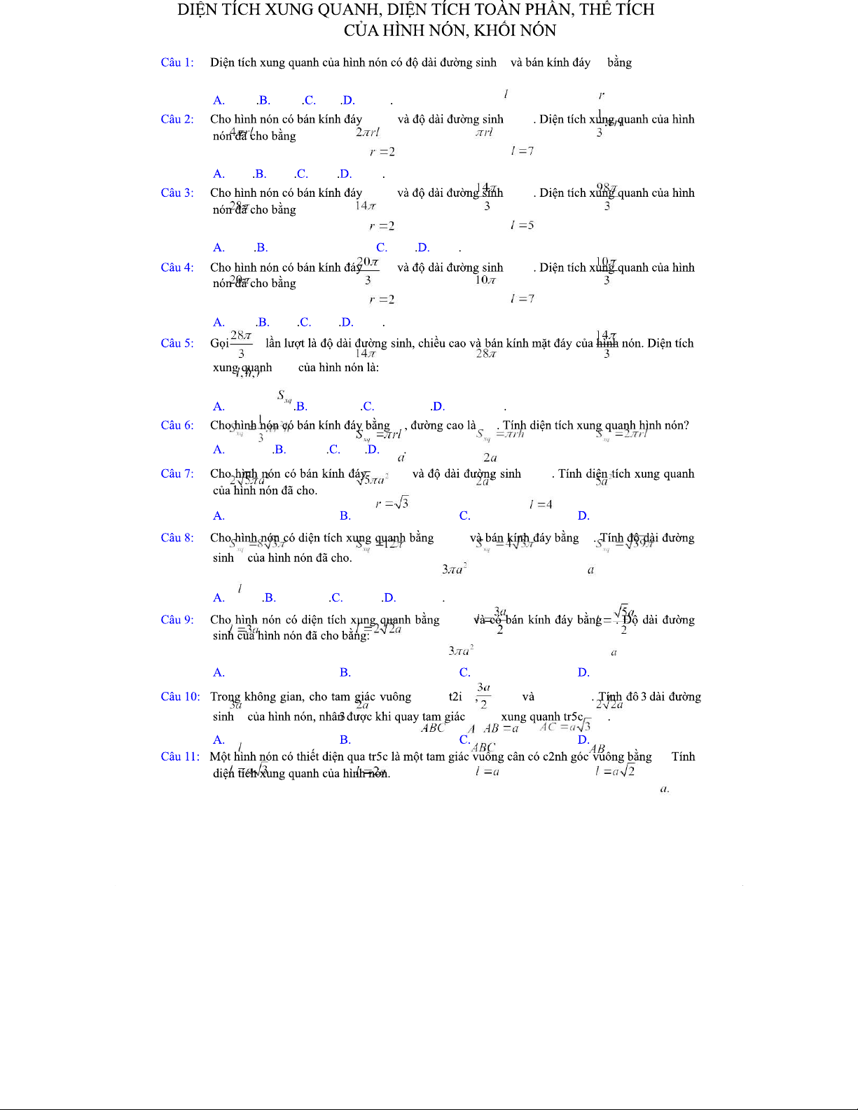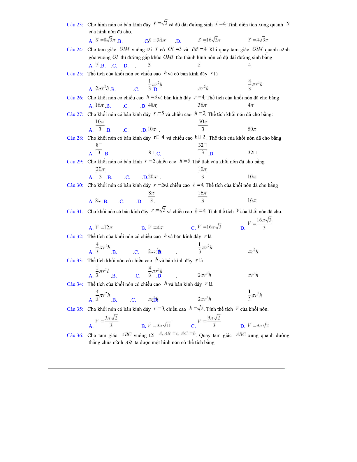 Diện Tích Xung Quanh và Thể Tích Của Hình Nón - Tài Liệu Ôn Tập