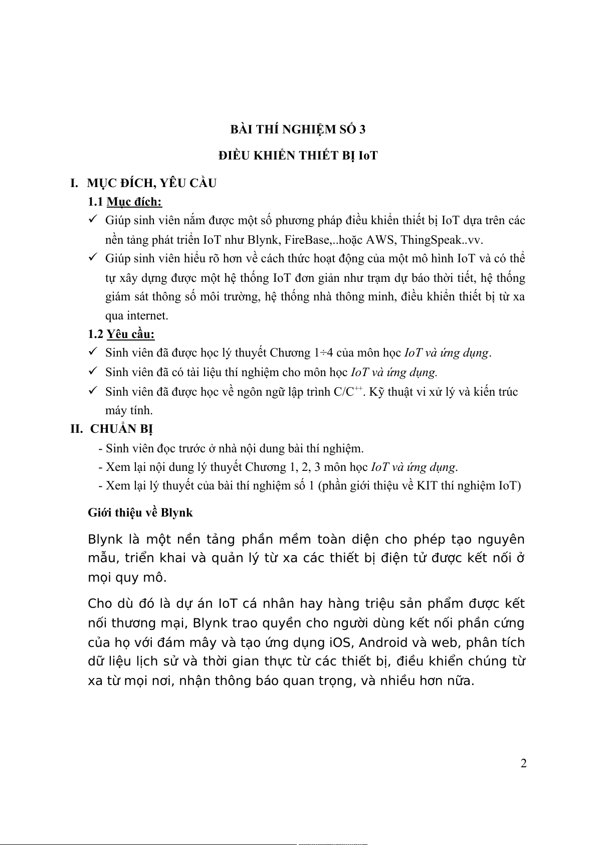 I. MỤC ĐÍCH, YÊU CẦU 1.1 Mục đích: