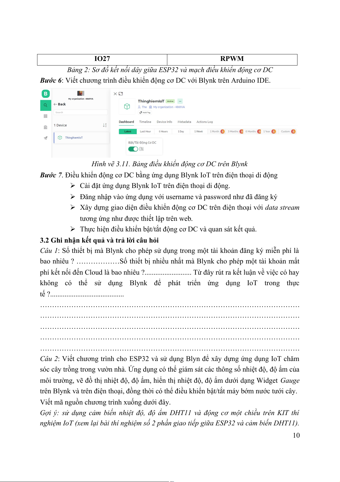 Câu 2: Viết chương trình cho ESP32 và sử dụng Blyn để xây dựng ứng dụng IoT chăm