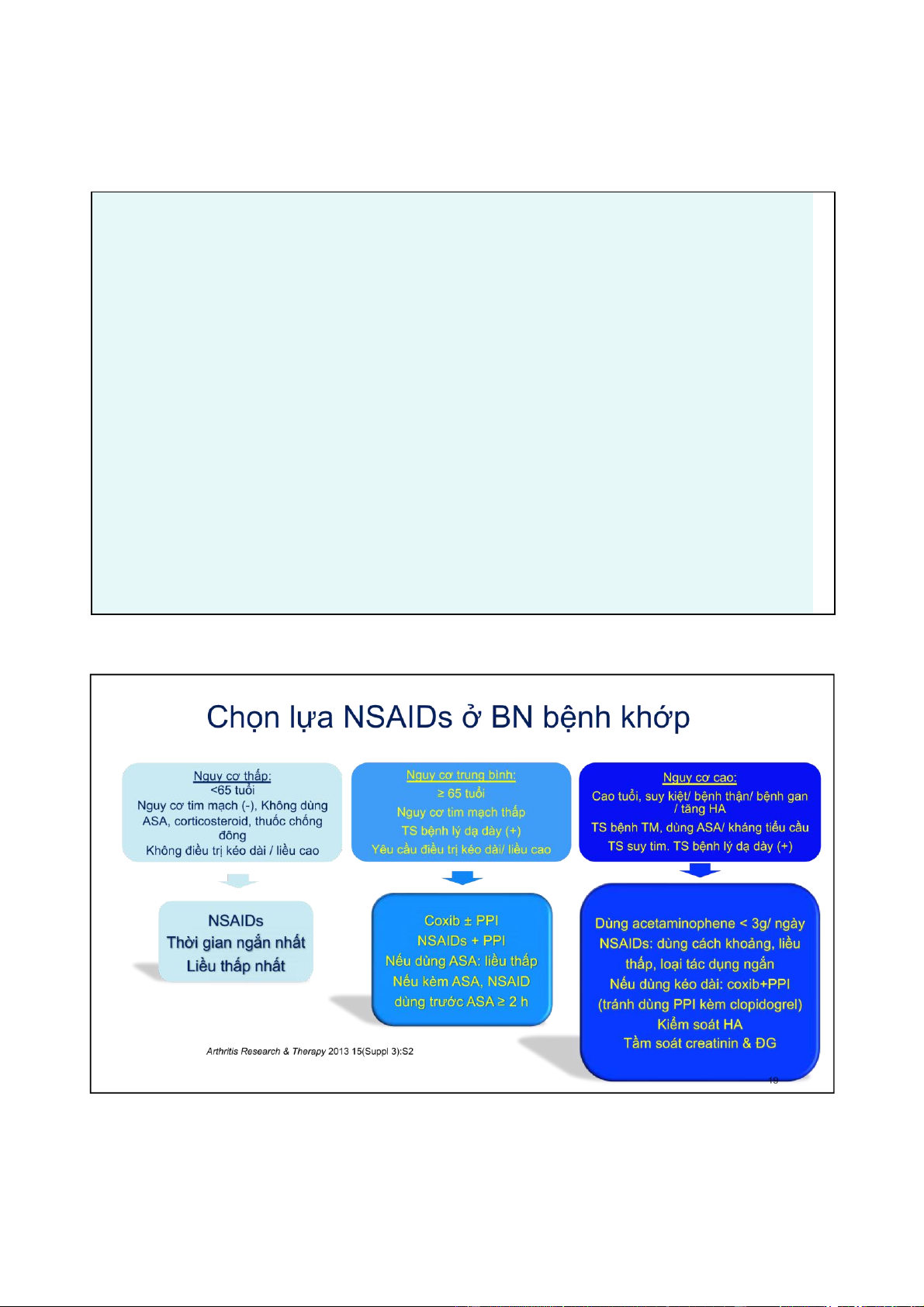 Khuyến cáo sử dụng NSAIDs Guideline Năm ban hành High GI risk Moderate GI risk Low GI risk EULAR 2003,2005, ns-NSAIDs + ns-NSAIDs + Any NSAID 2007 gastroprotection/ coxibs gastroprotection/ coxibs AHA 2007