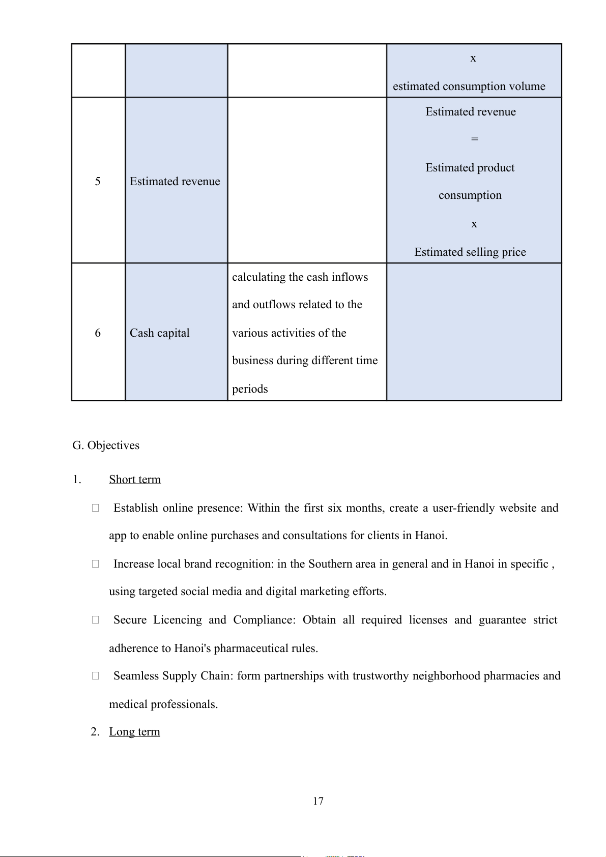 estimated fixed selling expenses Estimated selling 3 primary means involved in expenses the sales process + estimated variable selling expenses Estimated business Estimated relies on the management cost management business unit multiplied by the 4 = management expected consumption estimated variable expenses volume management cost per unit 16 x estimated consumption volume Estimated revenue = Estimated product 5 Estimated revenue consumption x Estimated selling price calculating the cash inflows and outflows related to the 6 Cash capital various activities of the business during different time periods G. Objectives 1. Short term