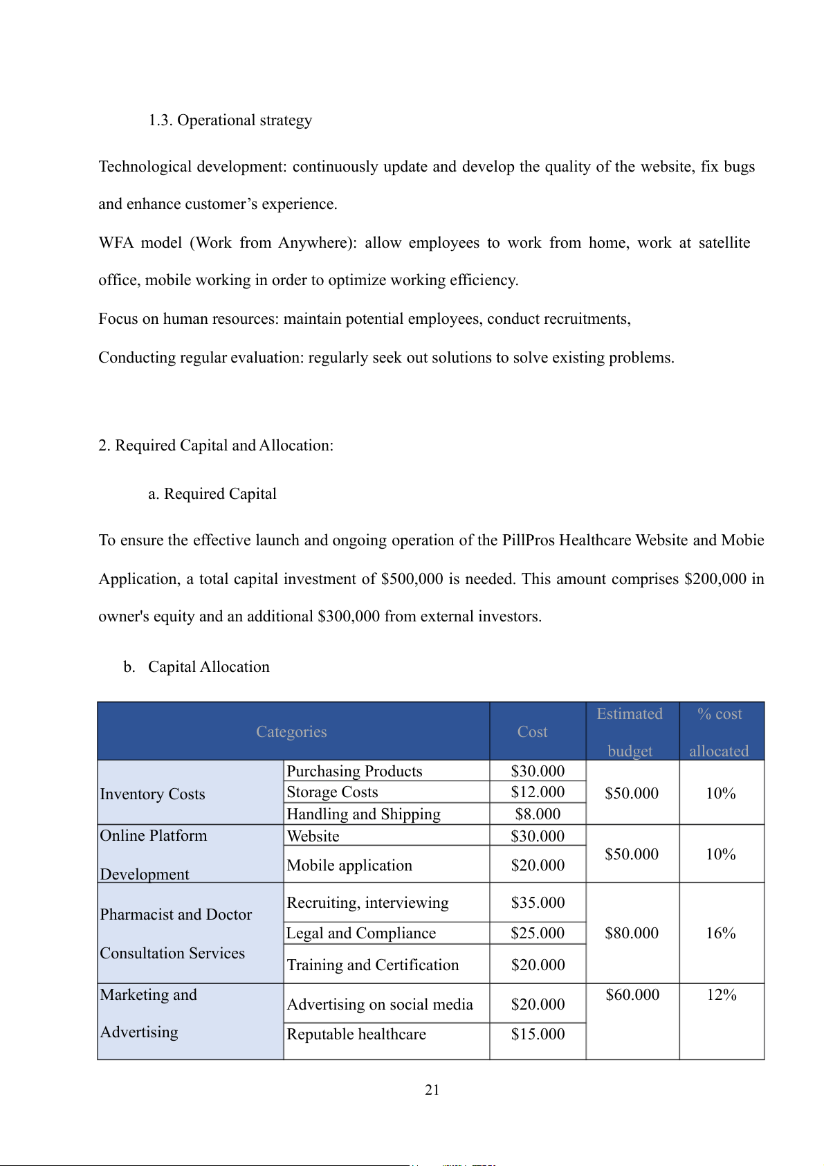 owner's equity and an additional $300,000 from external investors. b. Capital Allocation Estimated % cost Categories Cost budget allocated Purchasing Products $30.000 Inventory Costs Storage Costs $12.000 $50.000 10% Handling and Shipping $8.000 Online Platform Website $30.000 $50.000 10% Development Mobile application $20.000 Recruiting, interviewing $35.000 Pharmacist and Doctor Legal and Compliance $25.000 $80.000 16% Consultation Services Training and Certification $20.000 Marketing and $60.000 12% Advertising on social media $20.000 Advertising Reputable healthcare $15.000 21
