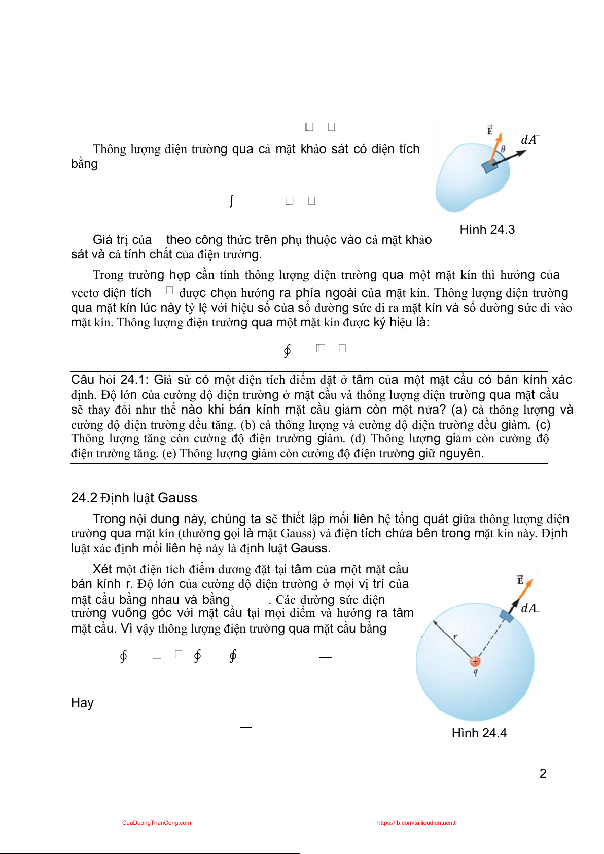 mặt cầu. Vì vậy thông lượng điện trường qua mặt cầu bằng ∮ ∮ ∮ Hay Hình 24.4 2 CuuDuongThanCong.com