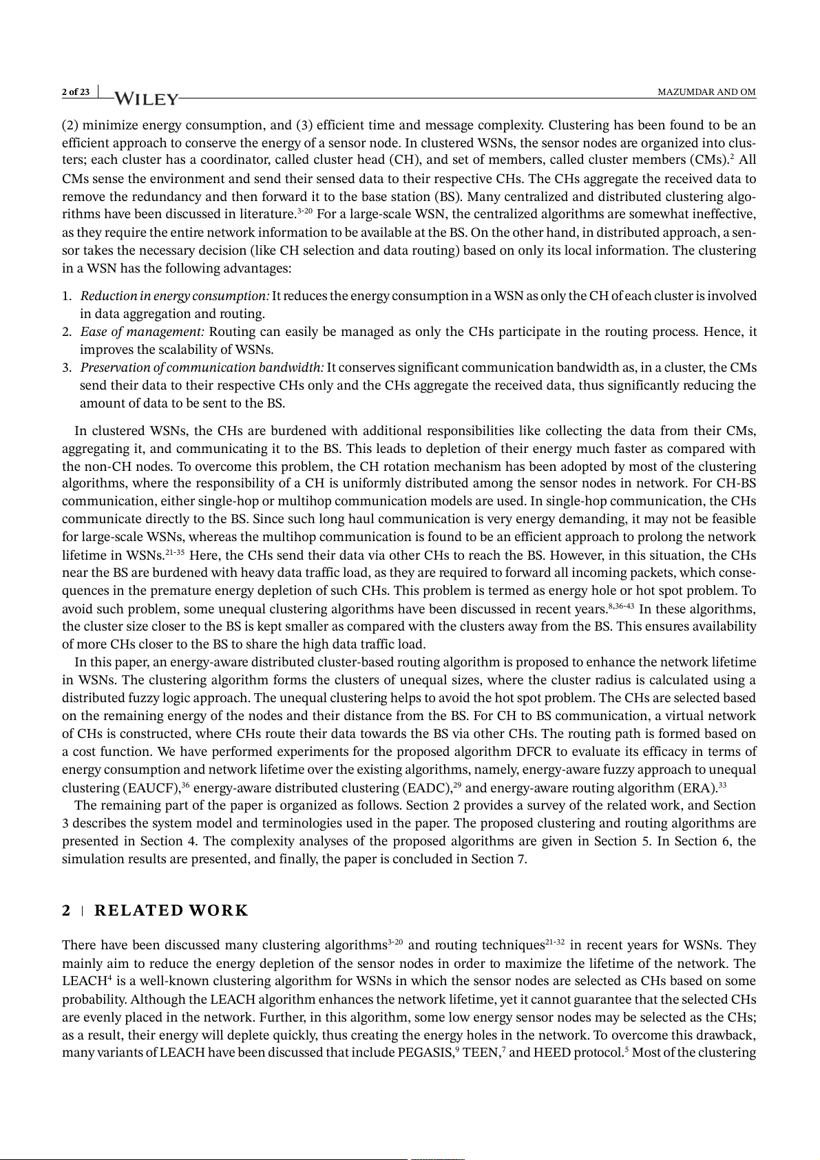many variants of LEACH have been discussed that include PEGASIS,9 TEEN,7 and HEED protocol.5 Most of the clustering MAZUMDAR AND OM 3 of 23