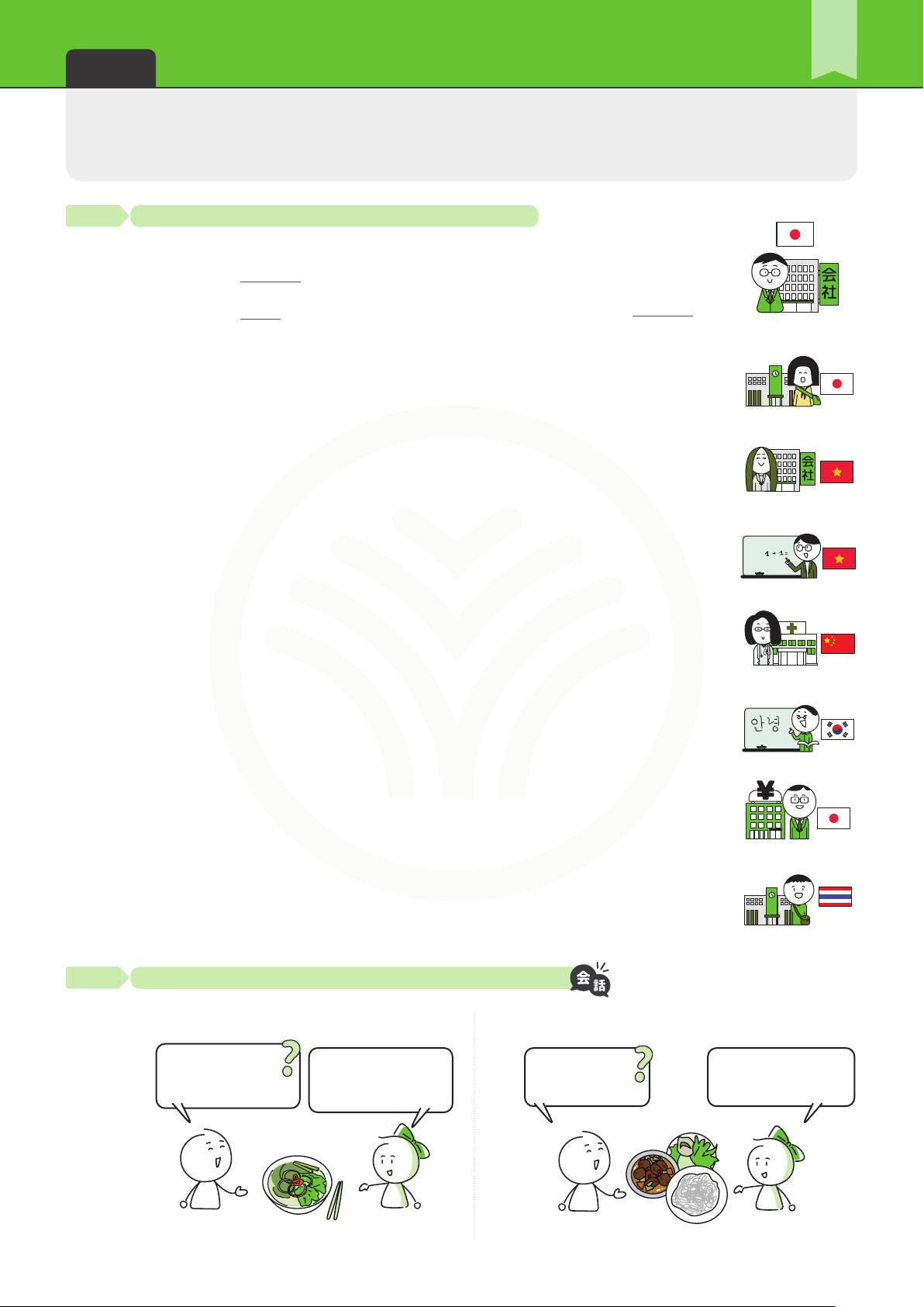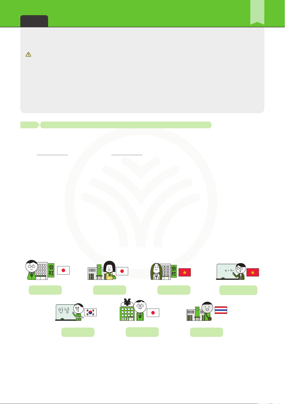 vai trò như một danh từ) ベトナム人 ベトナムじん người Việt Nam (N) 日本人 にほんじん người Nhật 中国人 ちゅうごくじん người Trung Quốc 韓国人 かんこくじん người Hàn Quốc タイ人 タイじん người Thái 私 (N) わたし tôi 医者 (N) いしゃ bác sĩ 教師 (N) きょうし giáo viên, giảng viên 先生 (N) せんせい thầy/ cô giáo 銀行員 (N) ぎんこういん nhân viên ngân hàng 会社員 (N) かいしゃいん nhân viên công ty 学生 (N) がくせい sinh viên (お)名前 (N) おなまえ / なまえ tên, họ tên 料理 (N) りょうり món ăn ベトナム料理 (N) ベトナムりょうり món ăn Việt Nam 日本料理 (N) にほんりょうり món ăn Nhật Bản ビール (N) ビール bia コーヒー (N) コーヒー cà phê 6