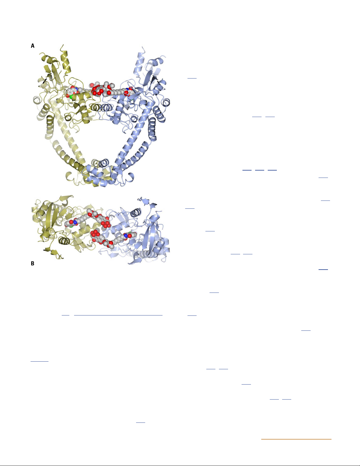 gold and blue (ribbon representation), and the bound simocyclinone